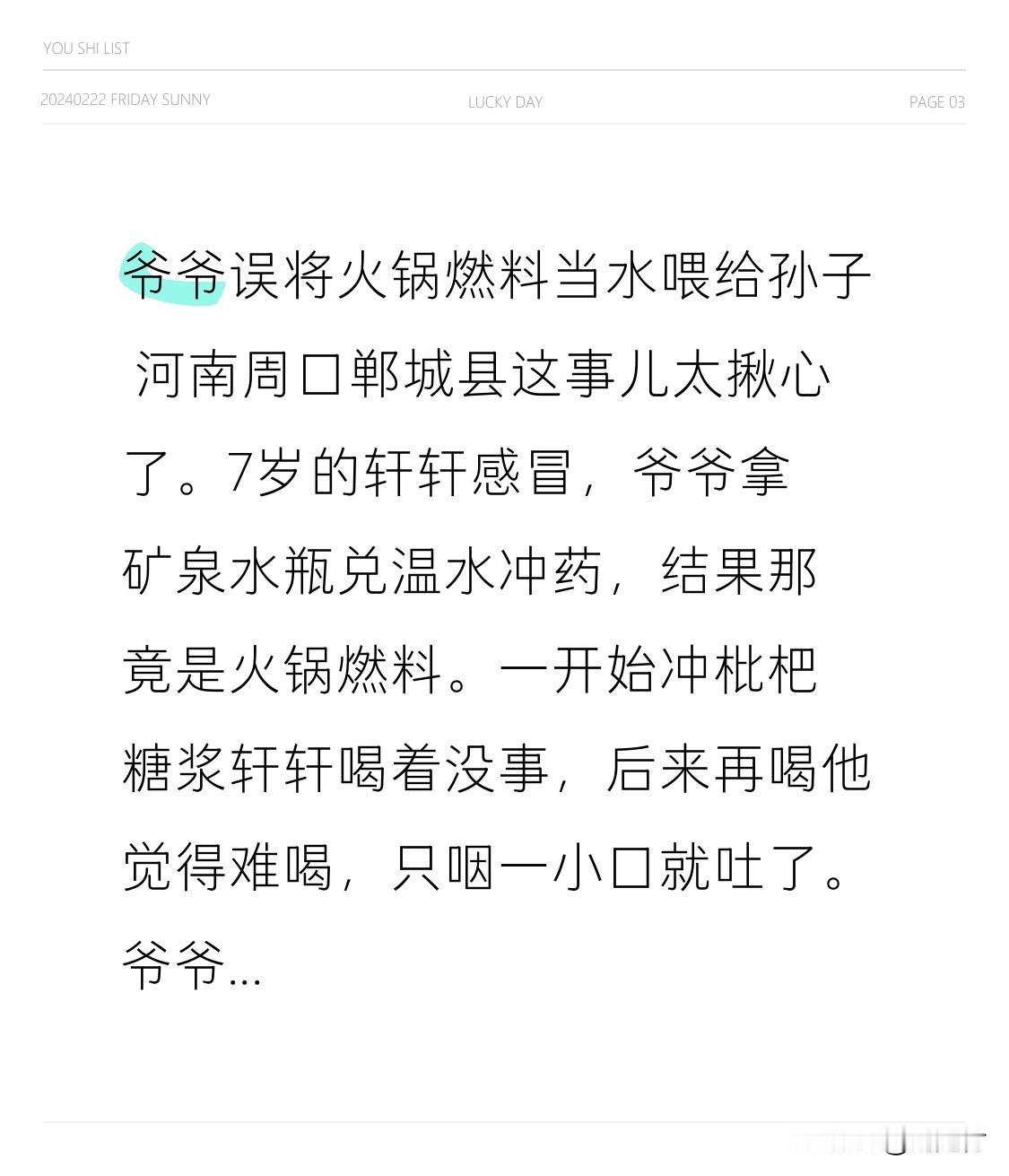 爷爷误将火锅燃料当水喂给孙子 河南周口郸城县发生了一件揪心的事,爷爷误将火锅燃料