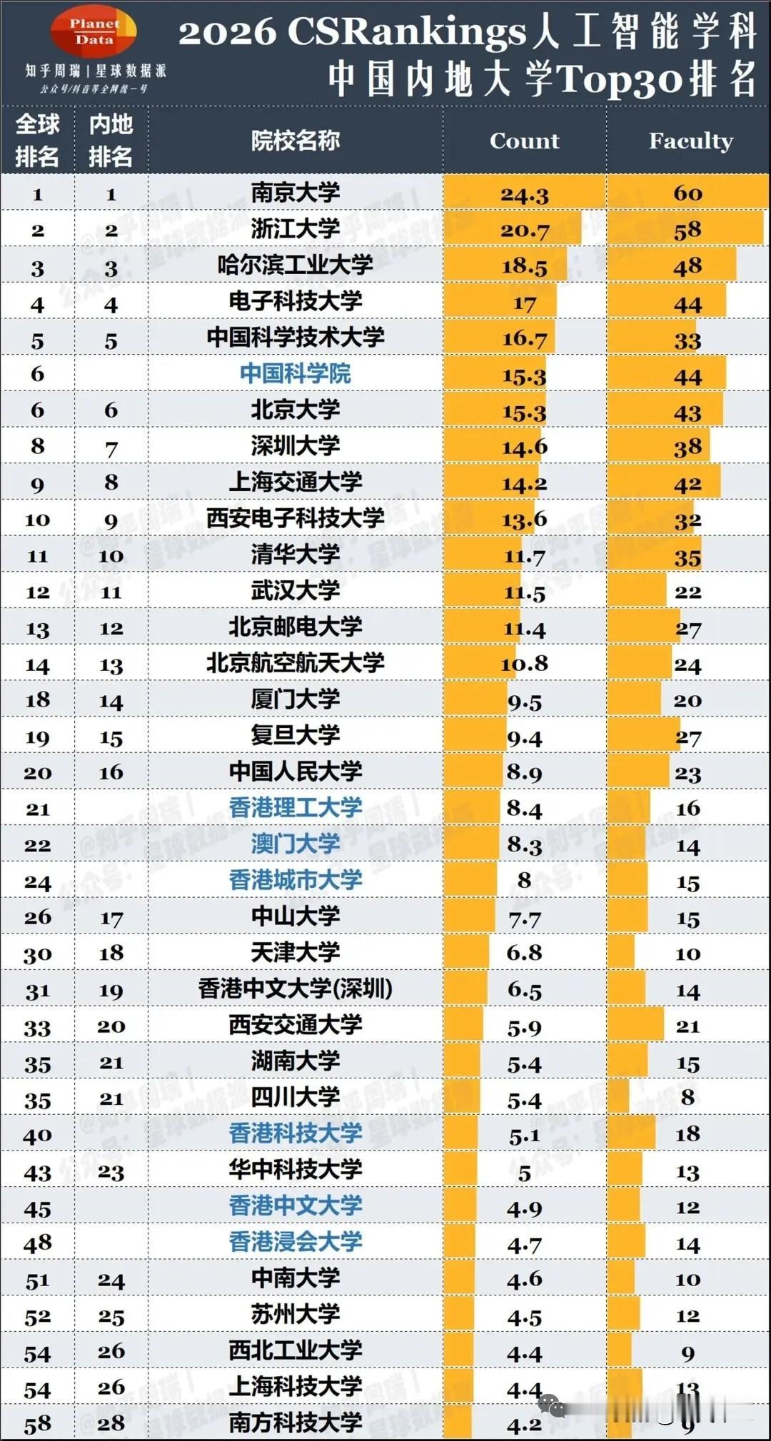 人工智能(AI)这几年真的是如日中天,发展迅猛。而高校的人工智能学科也成了香饽饽! 根据最新的CSRankings发布的人工智能学科排行榜来看,内地高校势头强劲,共有23所(不含港澳台)大学进入了世界50强,几乎占了一半。 更厉害的是,全球前十的高校中有九所内地高校。其中南京大学、浙江大学和哈尔滨工业大学稳稳占据世界前三;而电子科技大学和中国科学技术大学则分列第四和第五位。 相比于南大、浙大等,北京大学和清华大学这两所全国TOP2高校却稍显低调,分别排在了全国第六位和全国第十位,世界第六和第11位,清华大学甚至不及排在世界第八位的深圳大学,也是让人惊掉了下巴!