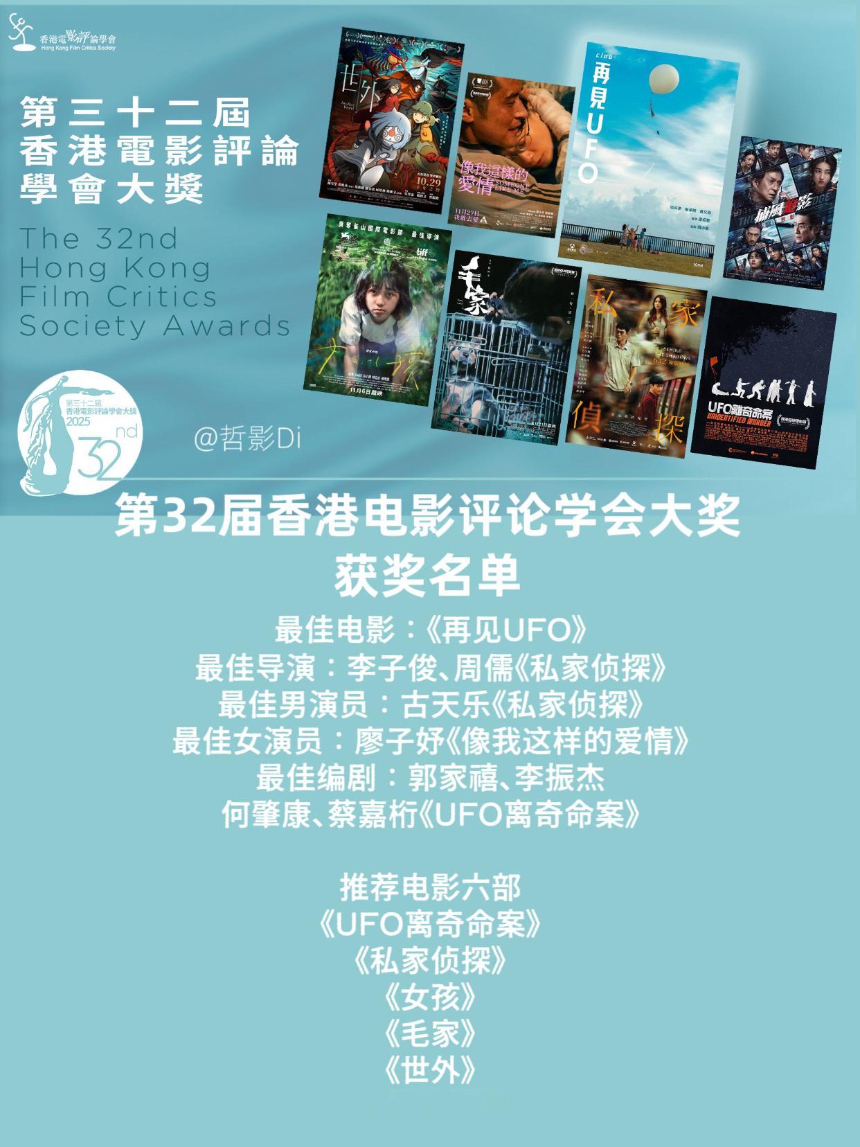 第32届香港电影评论学会大奖获奖名单公布,影片《再见UFO》获得最佳影片,古天乐凭借《私家侦探》获得本届最佳男主角,最佳女主角则被《像我这样的爱情》中的廖子妤摘得,舒淇的长片首作《女孩》则进入推荐电影名单。