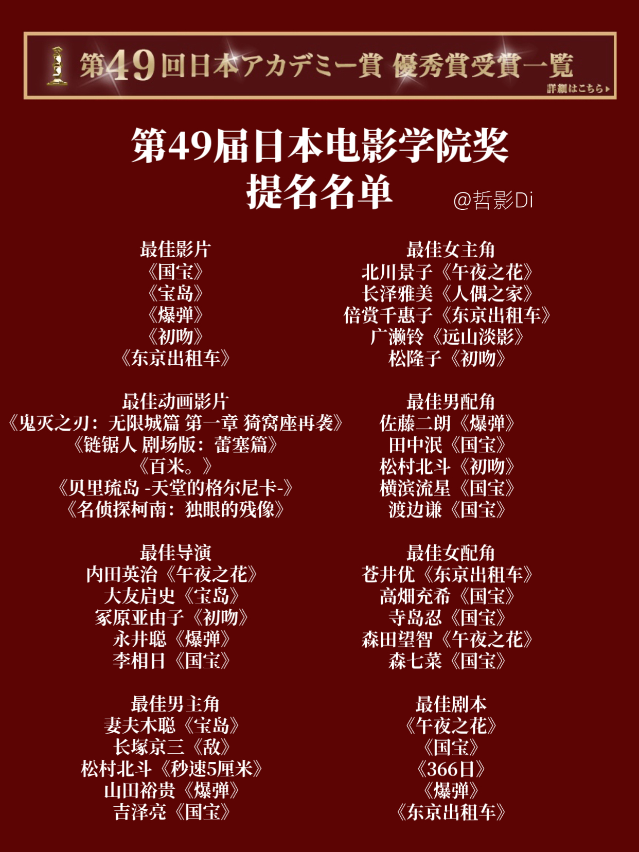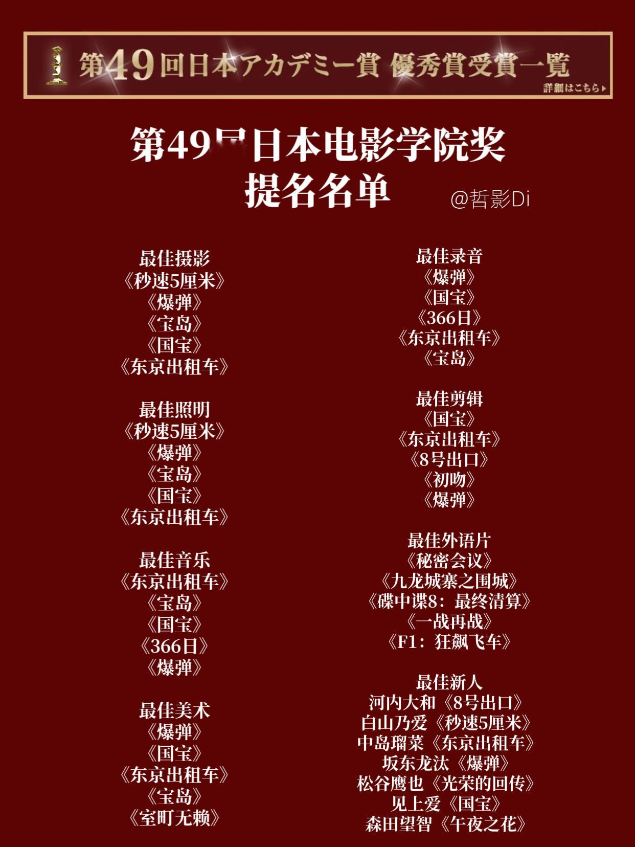 第49届日本电影学院奖提名名单公布,李相日执导的影片《国宝》以17项提名领跑,妻夫木聪主演的《爆弹》则获得12项提名紧随其后,木村拓哉主演的《东京出租车》获得11项提名跻身前三。中国香港电影《九龙城寨之围城》提名最佳外语片,《鬼灭之刃》则将与《名侦探柯南》争夺最佳动画影片奖。提名名单见图1、图3。