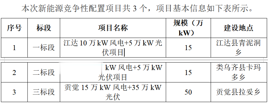 本次优选共划分三个标段,其中风电总计350MW,光伏550MW。