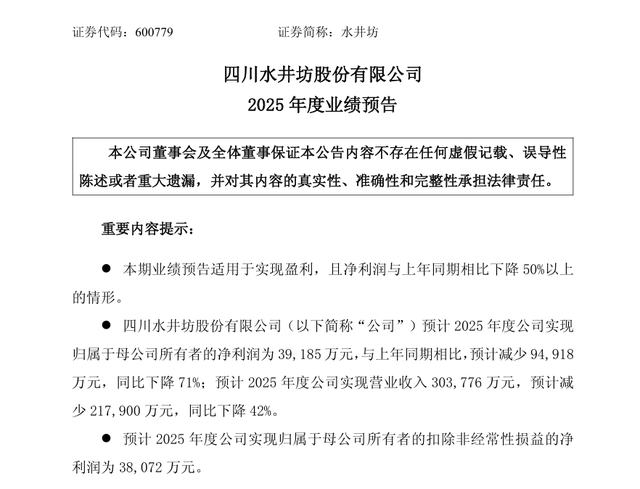 此外,水井坊还提示,公司不存在影响本次业绩预告内容准确性的重大不确定因素。以上业绩预告数据仅为初步核算数据,具体准确的财务数据以公司正式披露的2025年度报告为准,敬请广大投资者注意投资风险。
