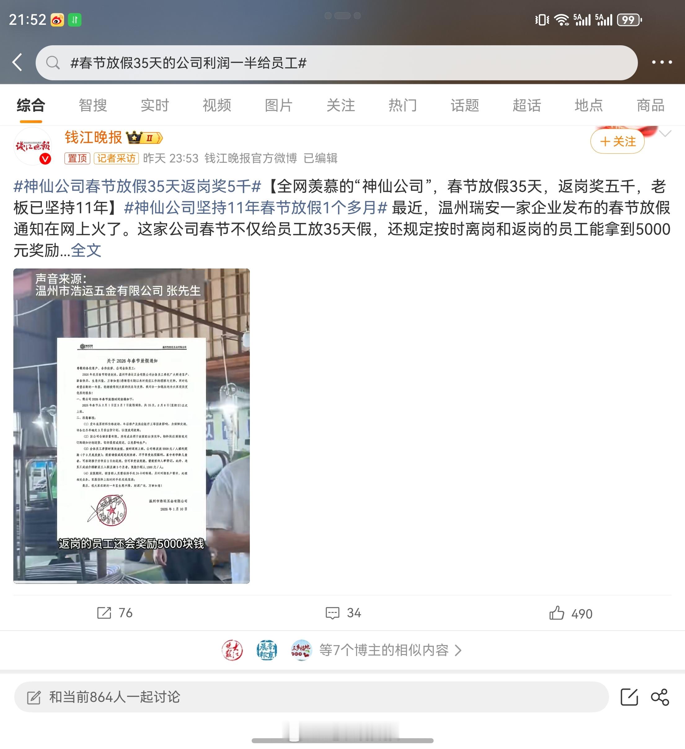 春节放假35天的公司利润一半给员工浩运五金发布了2026年春节放假安排,2月1日至3月7日放假调休,共35天。全体员工若按时离岗放假、按时返岗,公司将发放每人5000元的福利奖励,奖金于3月底发放。 我的天,这年头还有这种公司太难得了 广州