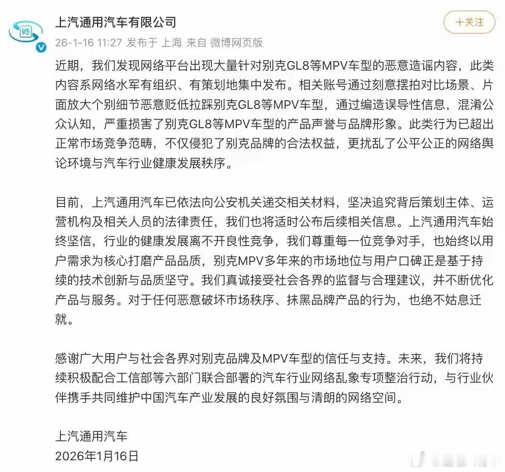 左右观车 别克GL8遭水军抹黑,幕后推手直指竞争对手?|聚焦民生【汽车民生获悉,上汽通用汽车1月16日通过官方微博发布严正声明,直指网络平台出现大量针对别克GL8等MPV车型的恶意造谣内容,系网络水军有组织、有策划的集中行为。】这一事件不仅撕开了汽车行业网络竞争的冰山一角,更让公众聚焦于这场舆情风暴背后的幕后推手。从声明描述的“刻意摆拍对比场景、片面放大个别细节”等手法来看,此类操作具有高度的商业针对性。别克GL8作为国内MPV市场的标杆车型,常年占据高端商务MPV销量榜首,其市场地位正是众多竞争对手的“眼中钉”。在当前MPV市场加速扩容的背景下,这一轮精准抹黑的时间点耐人寻味,恰逢多款重磅竞品即将上市的关键节点,其中既包括传祺M8宗师系列的改款车型,也有新能源品牌推出的高端MPV新品。业内人士分析,这种有组织的水军攻击,极可能与直接竞争对手的市场动作高度关联。一方面,传统燃油MPV阵营中,传祺、腾势等品牌正通过产品升级持续冲击GL8的市场份额;另一方面,新能源MPV车型凭借智能化配置和电动化体验,正在分流GL8的潜在用户。在新车上市前发起舆论攻势,试图动摇GL8的用户信任,是商业竞争中常见的“非常规手段”。值得注意的是,此次事件正值工信部等六部门联合开展汽车行业网络乱象专项整治行动的关键期。上汽通用选择直接向公安机关递交材料,不仅是为维护品牌权益,更意在借监管力量震慑行业内的不正当竞争行为。随着调查深入,幕后策划主体的身份或将水落石出,而这一事件也将成为观察中国汽车行业竞争生态的重要样本。别克GL8遭遇的舆情狙击,本质上是MPV市场存量竞争白热化的缩影。无论幕后黑手是谁,这场风波都在警示行业:唯有坚守技术创新与品质底线,才能在激烈的市场竞争中真正站稳脚跟。闲话民生:别克GL8被恶意抹黑的闹剧,看似是车企间的商业博弈,最终影响的却是普通消费者。当水军刻意放大细节、编造谣言,不仅扰乱了公平的市场环境,更让选车的老百姓难辨真假。这种不正当竞争,坑的是想买到靠谱车的家庭和创业者,也寒了消费者对整个行业的信任。是谁在背后摸黑别克GL8?评论区聊聊!