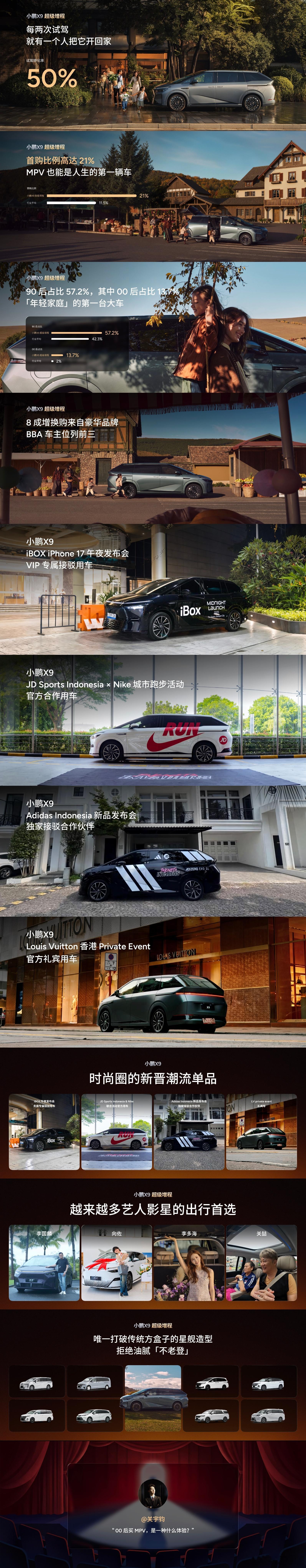 我鹏X9增程版这个转换率惊到我了每两次试驾 就有一个人选择了它首购车主比例竟然超过了1/5看来现在很多车友的第一辆车已经不拘泥于轿车或SUV了而且大家在今年春运的时候可以留意一下增程版X9不是可以车对车充电嘛所以征集了1000位车友在春运期间来当你车车的超大移动充电宝~小鹏X9年轻家庭的第一台MPV小鹏X9超级增程首个用户画像报告发布