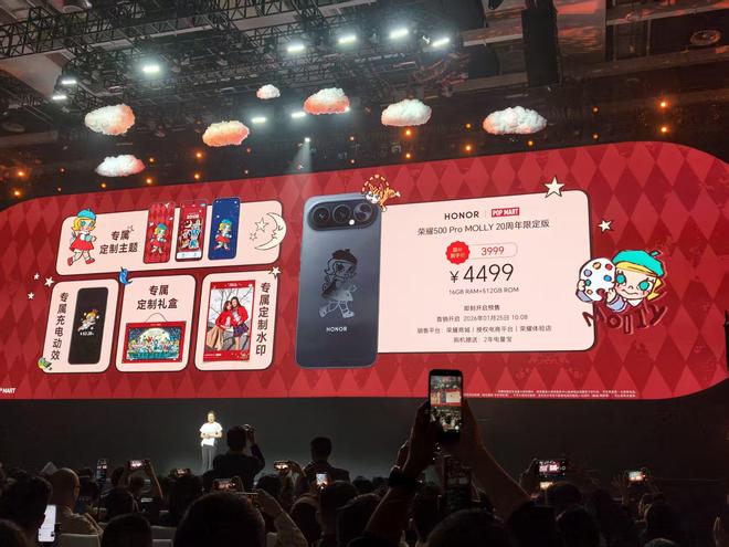对了,这场发布会上荣耀还带来了荣耀500Pro与泡泡玛特Molly的20周年联名款,仅曜石黑一个配色,随机附赠泡泡玛特Molly联名礼盒,内置Molly专属主题和个性水印。荣耀500Pro泡泡玛特Molly联名款定价4499元,国补后价格为3999元。对于喜欢Molly角色的朋友,这款机型还是相当有趣的。