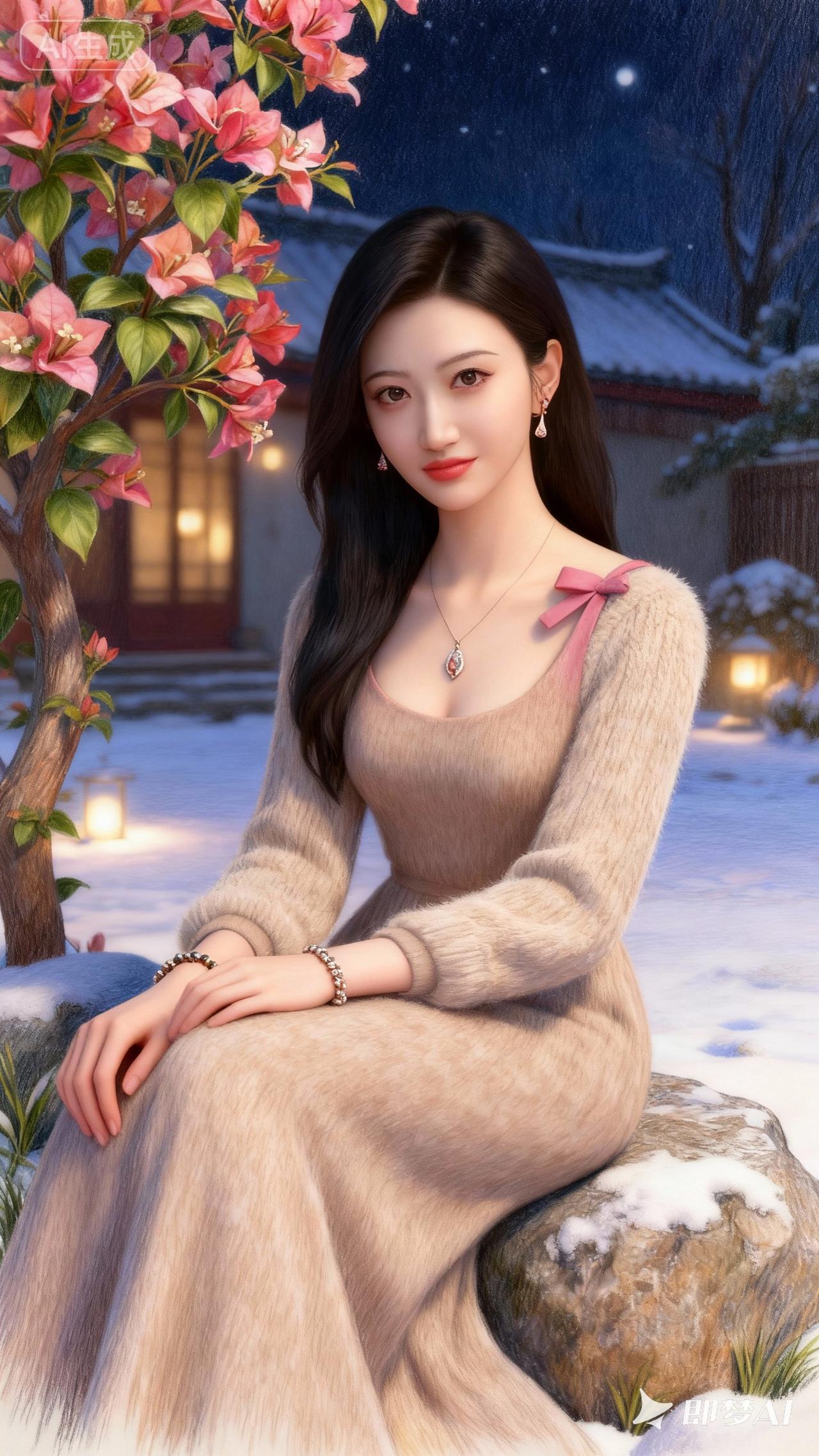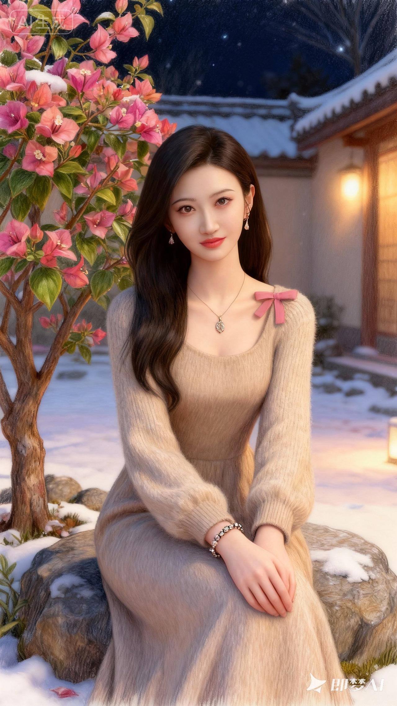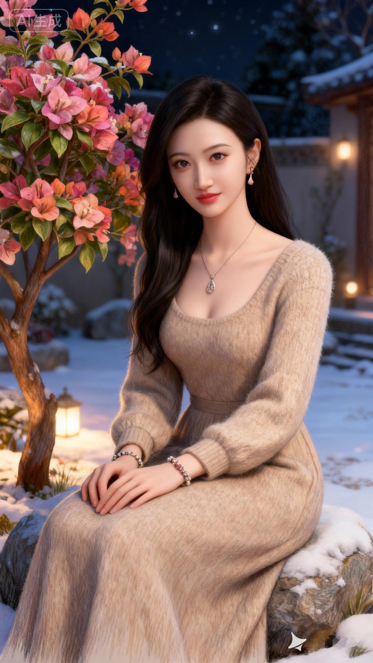 冬日暖阳下,优雅的少女与盛开的樱花树相映成趣。
