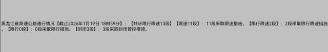 19日19时,记者从黑龙江省公安厅交通管理总队高速交管部门获悉,截至目前,受省内新一轮降雪影响,已有哈牡高速等13段高速限速或限速限行,3段高速封闭。封闭高速为哈同高速(哈尔滨段)、鹤哈高速(哈尔滨段)、鹤哈高速(绥化段)。