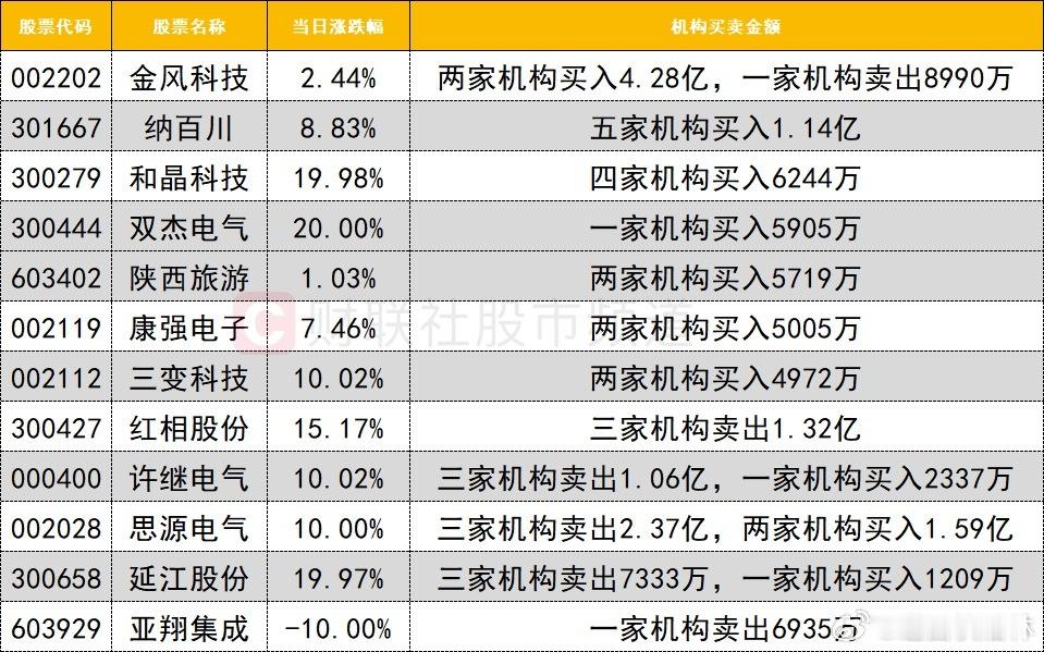 a股 龙虎榜1、机构今日龙虎榜机构活跃度较高,买入方面,金风科技获两家机构买入4.28亿,同时遭一家机构卖出8990万。卖出方面,红相股份遭三家机构卖出1.32亿。电网设备概念今日爆发,其中思源电气遭三家机构卖出2.37亿,同时获两家机构买入1.59亿;许继电气遭三家机构卖出1.06亿。2、游资一线游资活跃度明显降低,商业航天人气股金风科技获一家一线游资(国泰海通证券南京太平南路)买入2.27亿。量化资金活跃度有所降低。多路量化资金激烈博弈中国西电,两家量化资金(开源证券西安西大街、高盛中国上海世纪大道)分别买入3.14亿、2.01亿,另一家量化资金(国信证券浙江互联网分公司)卖出6118万。