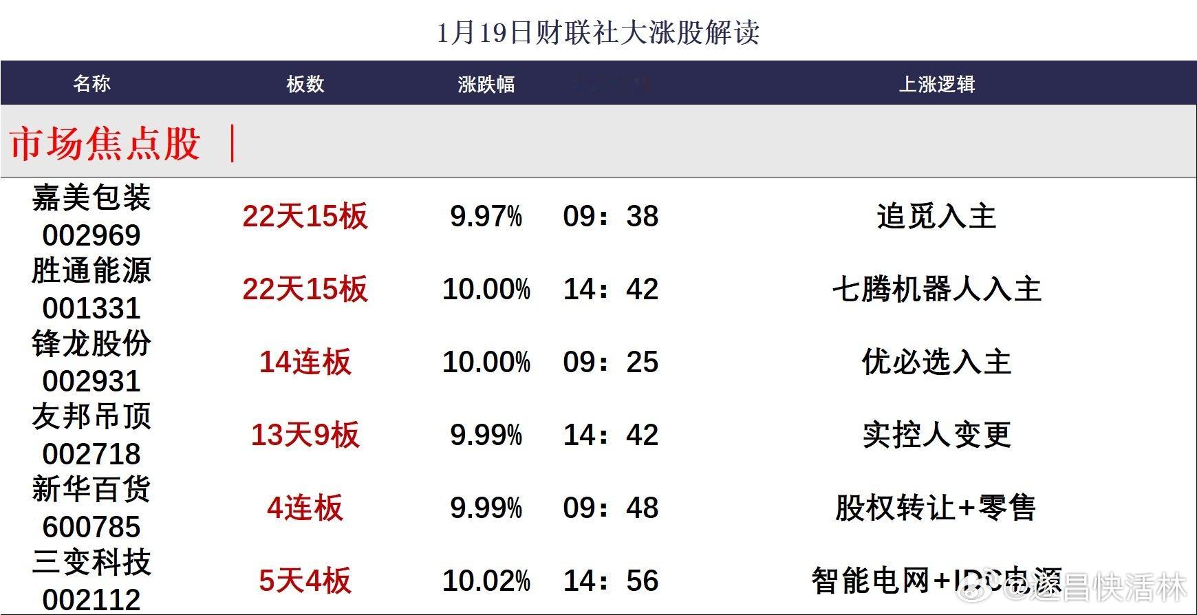 a股收评 【焦点复盘】创业板指冲高回落跌0.7%,AI软硬件双双低迷,贵金属板块再度爆发①连板晋级率仅3成,3板以上连板股降至仅2只,高位股分化依旧,三变科技盘中上演“地天板”,此前2连跌停的金风科技开板后展开反弹; ②当前沪指持续受到5日均线反压,且指数形成上涨缩量下跌放量结构,短线调整趋势或仍难逆转,关注下方20日均线附近的支撑力度。财联社1月19日讯,今日88股涨停,20股炸板,封板率为60%,锋龙股份14连板,新华百货4连板,嘉美包装、胜通能源22天15板,友邦吊顶13天9板,三变科技5天4板。三大指数涨跌不一,沪指走势较强,创业板指冲高回落。沪深两市成交额2.71万亿,较上一个交易日缩量3179亿。盘面上,全市场超3500只个股上涨。板块方面,电网设备、军工、机器人、贵金属板块领涨,算力硬件、AI应用、消费电子板块领跌。截至收盘,沪指涨0.29%,深成指涨0.09%,创业板指跌0.7%。人气及连板股分析连板晋级率33.33%,3板以上连板股降至2只,随着锋龙股份复牌后继续封死一字涨停,高位股展开局部修复,嘉美包装、胜通能源两只叠加并购重组概念的前期人气股双双封板。不过叠加前期领涨主线商业航天和AI应用两大方向的前期热门股亏钱效应不减,海格通信、神剑股份、东方通信等多股遭遇3连跌停。此前深幅调整的弹性方向随着做空动能释放完毕展开局部修复,上周冲高回落的北证电网股亿能电力实现30厘米反包板,上周复牌跌停的20厘米人气股志特新材盘中一度涨逾10%。不过随着短线卖压快速释放,部分前期高位股若能陆续展开止跌修复,则仍有利于短线市场情绪的平复。主线热点国家电网日前宣布,截至2025年底公司累计建成42项特高压工程,下一步,将开工建设浙江特高压交流环网、攀西特高压交流工程、辽宁清原抽水蓄能电站二期等重点项目。随着国网此前已经定下4万亿规模的“十五五”投资目标,电网设备股延续上周强势,思源电气晋级2连板,创出历史新高,板块人气股三变科技日内上演“地天板”,许继电气、特变电工等板块内龙头品种纷纷上演反包涨停。上周文章提到的受益电力出海方向的燃气轮机以及大储方向也表现不俗,万泽股份午后封板,应流股份、东方电气双双刷新阶段新高,储能概念海博思创也涨超10%。作为出海业绩弹性不输于半导体和算力硬件的一大核心方向,电力出海产业链当前表现也直接受益板块内一些业绩超预期品种,对于板块内绩优滞涨标的仍可积极挖掘。现代汽车上周五宣布,任命前特斯拉Optimus机器人项目负责人Milan Kovac出任顾问,此前旗下波士顿动力在月初的CES展会上发布了量产版的Atlas人形机器人。在近期产业链利好密集来袭刺激下,机器人概念延续上周强势,锋龙股份复牌一字涨停,走出14连板,趋势抱团股五洲新春、日盈电子双双涨停创历史新高。与上周回暖的算力硬件、半导体等年报业绩预增所主导的业绩驱动行情不同的是,当前主导机器人产业链走强的驱动因素仍以宇树科技为首的国内大厂以及海外的特斯拉Optimus的审厂以及量产因素的产业利好驱动为主,且板块内历史新高标的也多以各自为战而板块效应相对不足,因此暂时只能视为短线过度方向。证监会近日公开发行辅导公示系统显示,中科宇航于近日辅导工作完成。由此,国内5家主营运载火箭的商业航天公司——蓝箭航天、天兵科技、中科宇航、星际荣耀和星河动力均已开启IPO进程。商业航天概念在连续高位调整后表现回暖,两只中科宇航影子股越秀资本、广百股份双双涨停,此外板块内趋势抱团股相继,超捷股份一度涨超19%并刷新历史高点,泰胜风能、江顺科技、昊志机电等纷纷展开修复行情,此前2连跌停的金风科技早盘快速开板后也展开反弹动作。此外商业航天两大应用分支——太空算力以及3D打印方向同样表现亮眼,东睦股份、博迁新材双双涨停,迈为股份、钧达股份等盘中也一度冲高。虽然无论是参股线,抑或是一些分支应用的活跃仍反映商业航天概念当前热度依旧维持高位,但板块内高位股大面积跌停仍是当前压制板块情绪的最大障碍,整体性修复时点或仍未来临。近期国际贵金属价格续创历史新高,现货黄金价格一度升破4690美元,现货白银价格一度突破94美元/盎司。贵金属板块全天表现亮眼,四川黄金反包涨停,山金国际、晓程科技涨逾5%,均创历史新高。此外近期黑钨精矿价格突破50万元/吨,中钨高新、章源钨业、厦门钨业也刷新历史高点。除去有色板块外,近期受益行业反内卷以及出口放量,化工、农药板块表现也持续转暖,昊华科技、利尔化学、云图控股等多股涨停并创出阶段新高。在当前市场整体风偏相对不足背景下,叠加业绩披露高峰期仍有利于短线资金继续向几大业绩确定性增长方向聚焦,但这类趋势抱团股在连续加速后,也容易引发短线客的集中兑现,连续加速后再行追涨并不可取。后市展望今日指数全天表现分化,沪指低开高走结束4连跌,4100点失而复得,但创业板指受到AI软硬件同时拖累走出冲高回落行情,最终失守10日线。虽然今日个股超3500股飘红,但今日80余股涨停的同时,非ST跌停股仍有20多家,反映市场做空动能尚未释放完毕,关注跌停股家数能否迅速收窄至个位数。从沪指方面看,该指数最近3个交易日持续受到上方5日均线压制,且日线KDJ在上周二死叉后持续向下尚未出现钝化走势,且MACD红柱也持续收窄,结合当前指数形