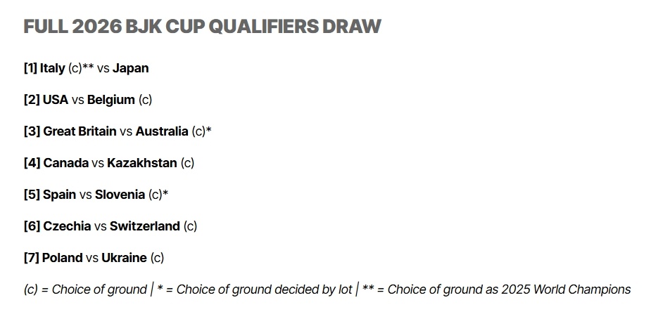 2026赛季比利·简·金杯资格赛抽签结果出炉👀意大利 vs 日本美国 vs 比利时英国 vs 澳大利亚加拿大 vs 哈萨克斯坦西班牙 vs 斯洛文尼亚捷克 vs 瑞士波兰 vs 乌克兰资格赛将在4月10日-11日进行,获胜的七支队伍晋级在九月份举办的比利·简·金杯总决赛,东道主中国队自动入围。