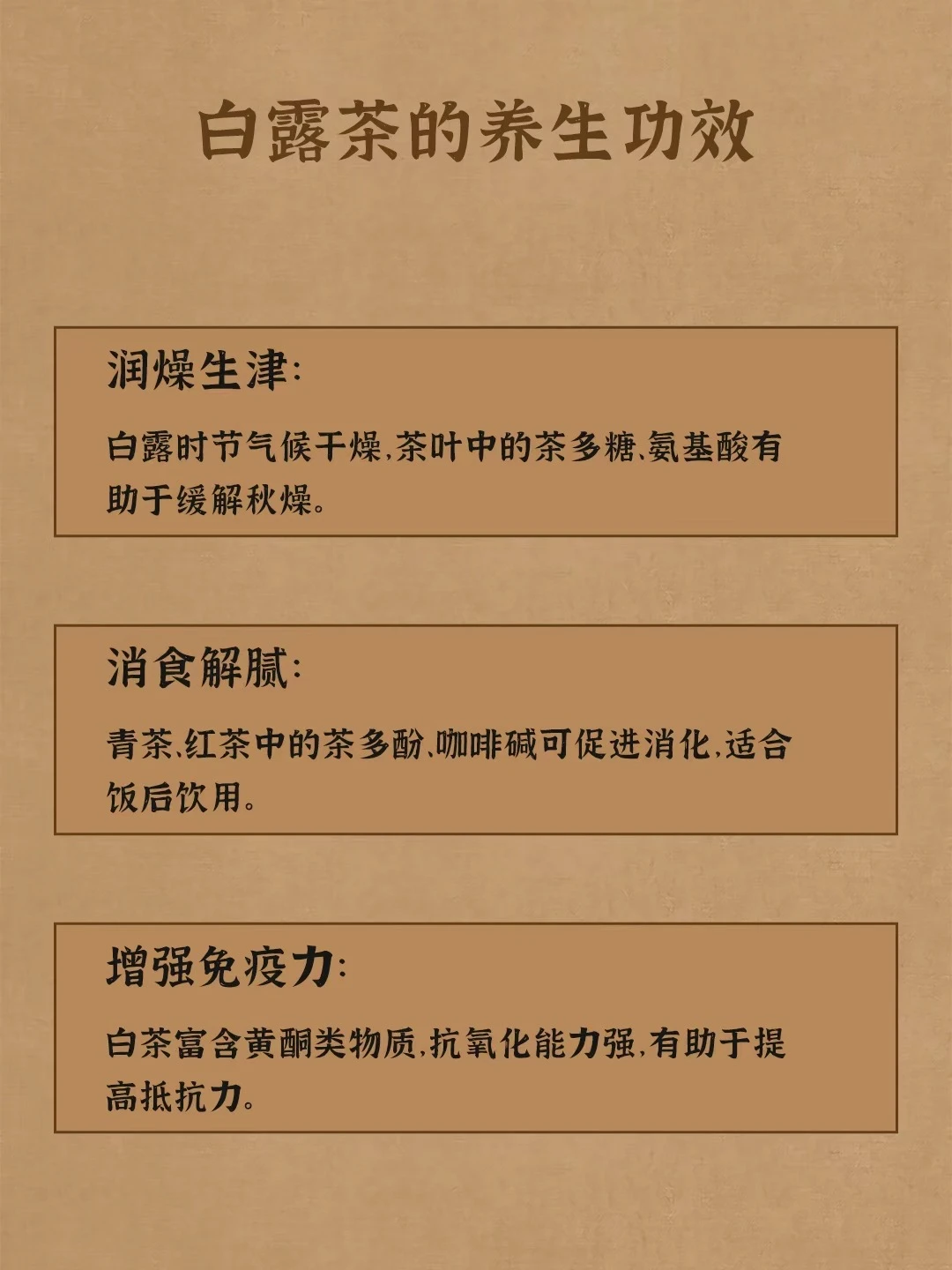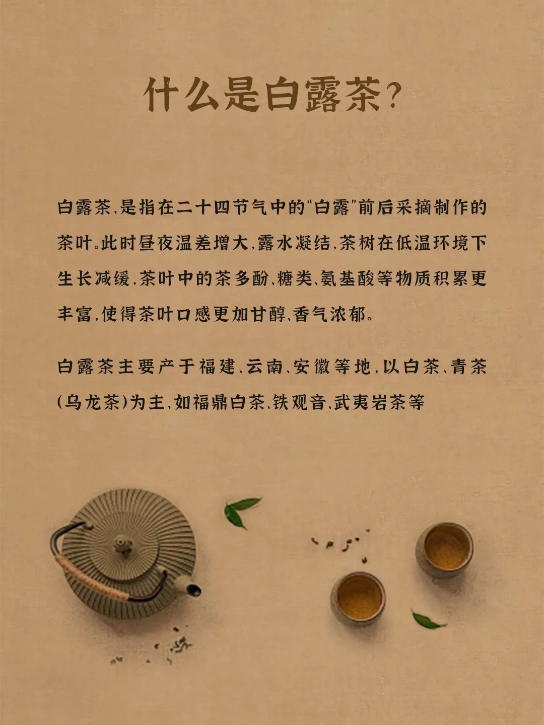 白露茶,是指在二十四节气中的“白露”(每年公历9月7日—9日)前后采摘制作的茶叶。此时昼夜温差增大,露水凝结,茶树在低温环境下生长减缓,茶叶中的茶多酚、糖类、氨基酸等物质积累更丰富,使得茶叶口感更加甘醇、香气浓郁。白露茶主要产于福建、云南、安徽等地,以白茶、青茶(乌龙茶)为主,如福鼎白茶、铁观音、武夷岩茶等。白露茶凭借其独特的时节风味和养生价值,成为秋季茶饮的上佳选择。无论是清甜的白茶,还是醇厚的青茶,都能让人在微凉的秋日里感受温暖与甘润。喜欢喝茶的朋友,不妨在白露时节品一杯应季茶,体验自然的馈赠。