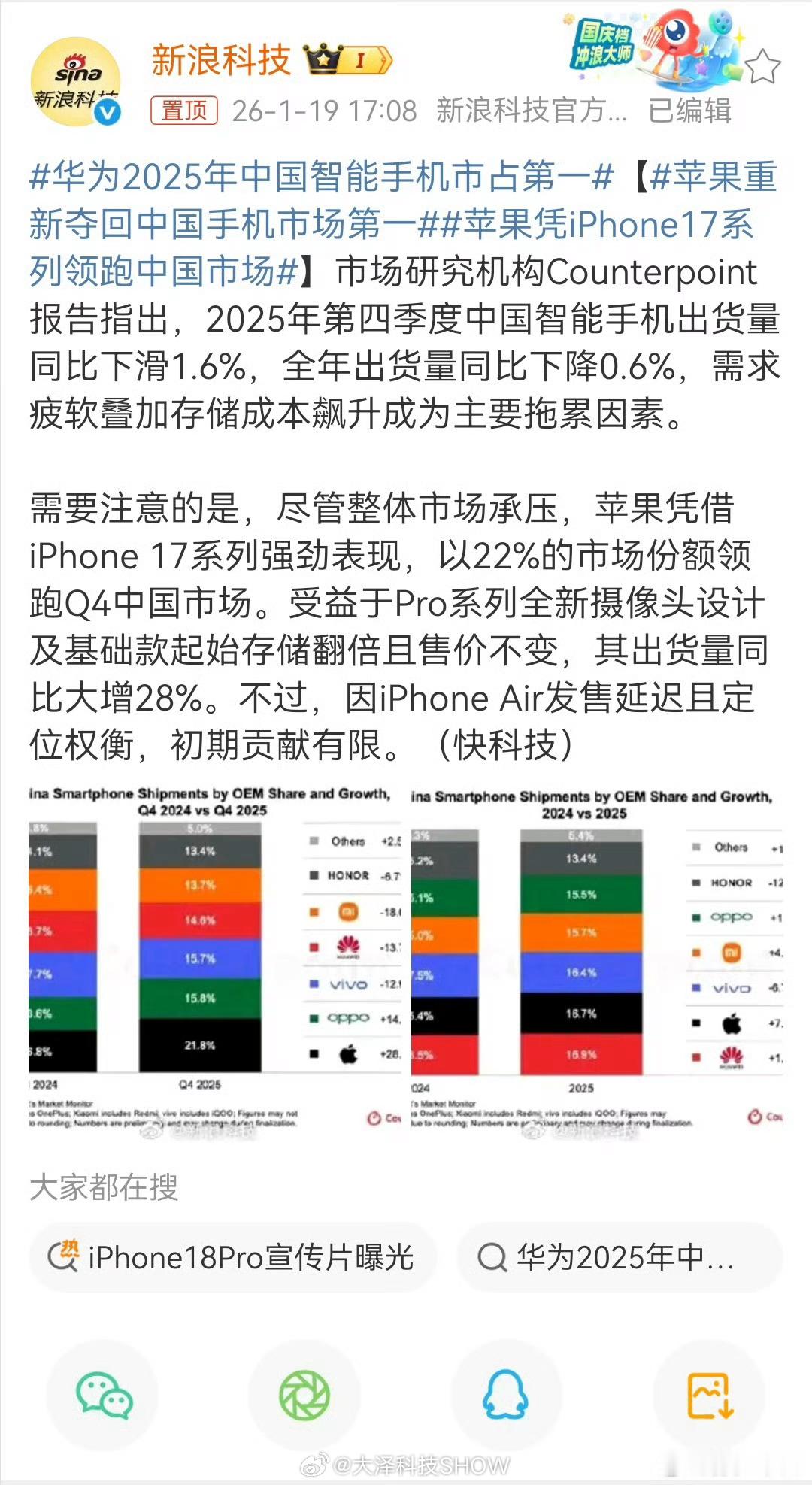 华为2025年中国智能手机市占第一这么说吧,如果苹果2026不出折叠屏的话,我还是看好华为! 苹果重新夺回中国手机市场第一