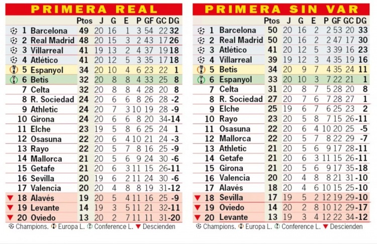 直播吧1月20日讯《阿斯报》统计了“如果没有VAR”的西甲积分榜情况,巴萨将增加1分、皇马将增加2分,两队将同积50分。