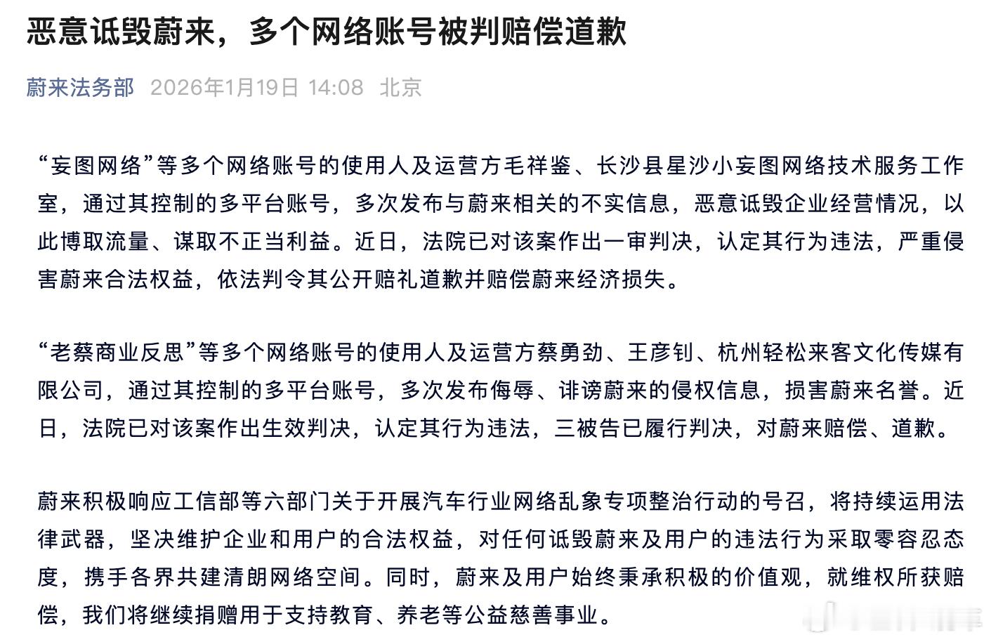 左右观车 蔚来维权再获突破,多账号造谣被判道歉赔偿|民生维权1月19日,蔚来法务部发布官方通报,披露多起网络侵权案件判决结果,引发行业关注。通报显示,“妄图网络”等账号及运营方长期发布蔚来不实信息,恶意诋毁企业经营,已被法院认定违法。该案中,账号使用人毛祥鉴及长沙县星沙小妄图网络技术服务工作室,通过多平台发布虚假内容博取流量。法院一审判决其公开赔礼道歉,并赔偿蔚来经济损失,相关判决已正式生效。另一案件中,“老蔡商业反思”等账号运营方蔡勇劲、王彦钊等人,多次发布侮辱诽谤蔚来的侵权信息。经法院审理,该案已作出生效判决,三名被告及关联公司已履行赔偿义务并公开致歉。蔚来方面表示,此次维权成果响应了工信部等六部门汽车行业网络乱象专项整治行动号召。据了解,蔚来近年持续遭遇网络恶意攻击,此前已有多个账号因造谣被查处或封禁。2025年11月,账号“西瓜犁多南”持有人贺奎因恶意攻击蔚来及用户,被判道歉并赔偿。抖音账号“森哥电车”长期侮辱诋毁蔚来,败诉后拒不悔改,已被依法依规采取封禁措施。2023年以来,蔚来诉抖音大V“小牛说车”案备受关注,一审判决其赔偿六十余万元并致歉90天。该账号发布的十一条侵权视频含人身攻击、侮辱女性内容,被认定违背公序良俗和核心价值观。除民事维权外,蔚来还针对多起恶意造谣案件向公安机关报案,部分涉案人员已被行政拘留。2025年7月,微信公众号“股海闲思录”等多个账号捏造乐道品牌黑公关谣言,蔚来已提起诉讼。同年10月,账号“途说汽车”造谣数百用户围堵蔚来办公室,“互联网料哥”抹黑换电模式,均被立案。蔚来法务部透露,目前仍有多起违法案件处于公安立案调查阶段,十余起民事诉讼正在推进中。对于维权所获全部赔偿款项,蔚来明确将全额捐赠,用于支持教育、养老等公益慈善事业。蔚来强调,将持续运用法律武器,对恶意诋毁企业及用户的违法行为坚持零容忍态度。此举不仅是为维护自身合法权益,更是为推动构建公平竞争、清朗有序的网络空间和行业环境。业内认为,随着网络造谣成本不断提高,企业主动维权将遏制行业乱象,保障消费者知情权。截至发稿,相关涉事账号已按判决要求删除侵权内容,公开致歉声明均已在指定平台发布。闲话民生:蔚来法务部维权胜诉,不仅是企业捍卫自身权益,更关乎民生福祉。网络不实信息易误导消费者购车决策,扰乱市场秩序。此次判决彰显法律威严,倒逼网络账号恪守底线,为车主营造真实、透明的信息环境,助力汽车消费市场健康发展。你对网络造谣、恶意攻击汽车品牌有什么看法和建议?评论区聊聊!