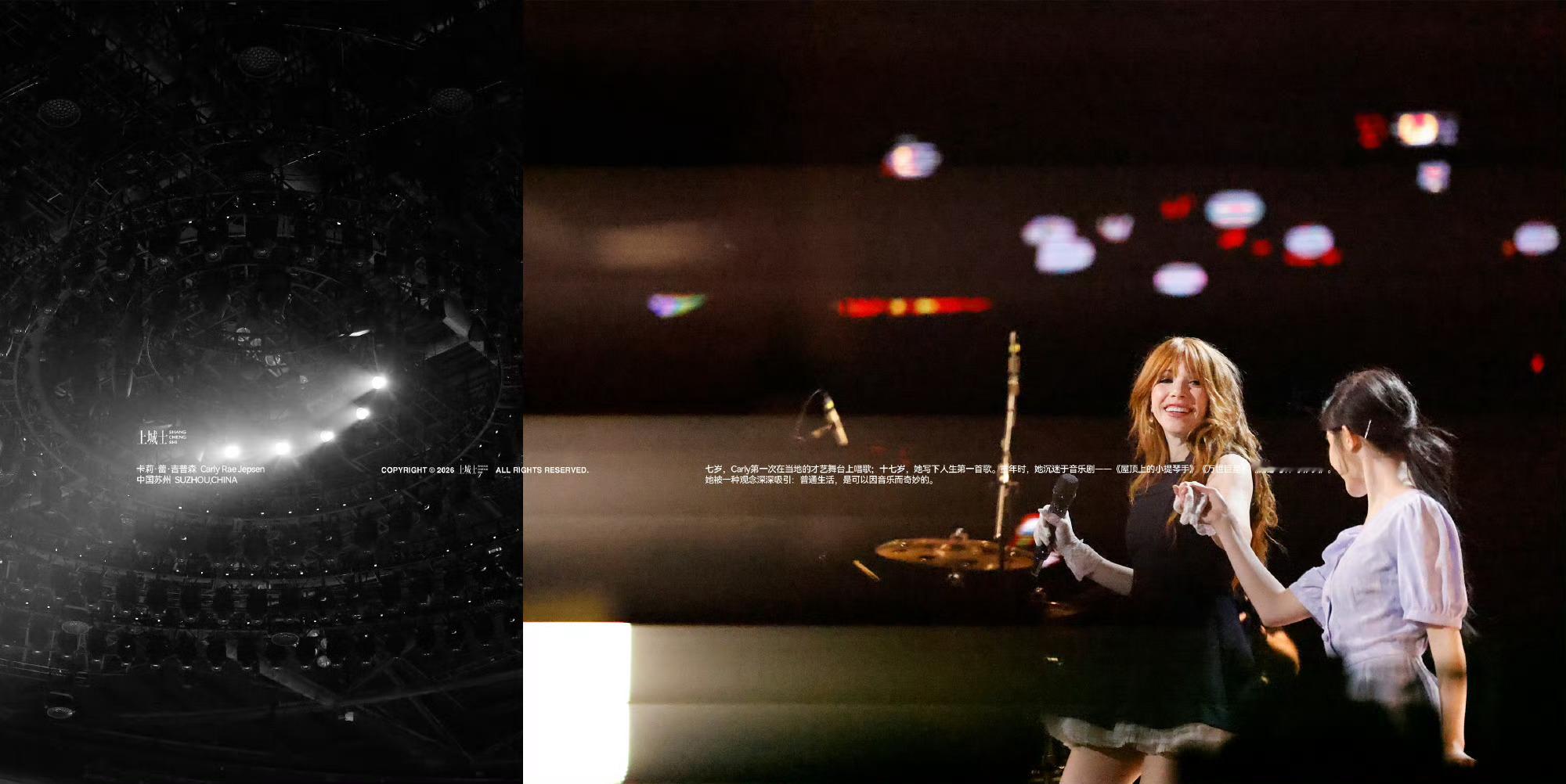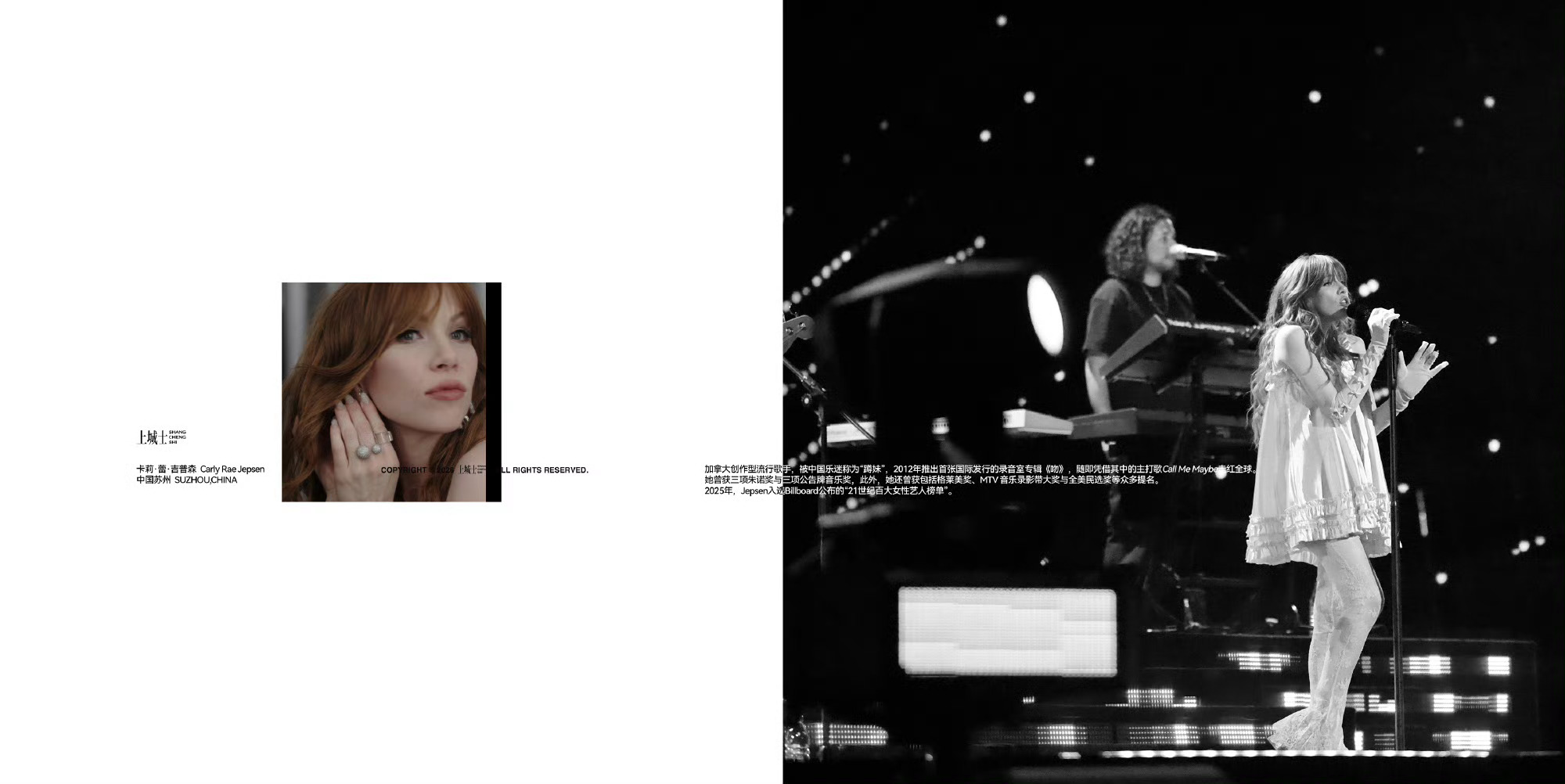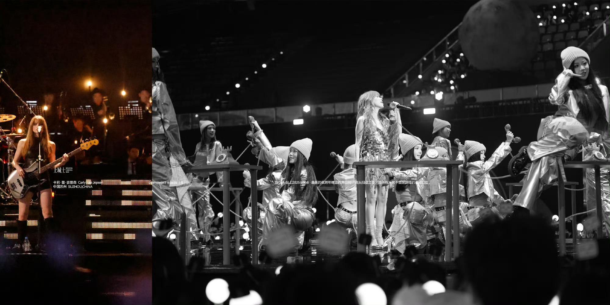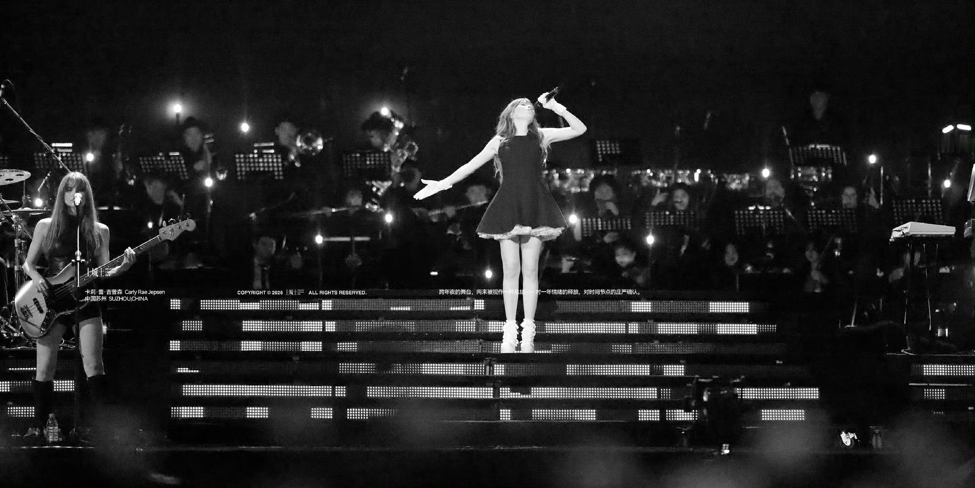 在很多90后、00后的记忆里,Carly Rae Jepsen的歌并不是某一个明确的人生事件,而是一段段反复出现的日常背景音。2011年圣诞,Call Me Maybe发布后很快受到Justin Bieber的喜爱与推荐,随即全网升温,在2012年成为全球最畅销单曲之一。那一年的夏天,这首歌无处不在——校园广播、聚会循环、电视节目、网络分享——它精准地落在大众的情绪坐标上,轻快、直接、毫不掩饰心动,也毫不害怕脆弱。在社交媒体尚未成为日常算法驱动中心的时代,世界还很简单:课后、夏天、第一次喜欢一个人,或者第一次意识到“流行音乐原来可以这样明亮”。当“蹲妹”站上“2025 bilibili ·最美的夜”跨年晚会的舞台时,镜头扫过之处,是所有人情不自禁跟唱的准确口型。网络平台上,画面被情绪拉满的弹幕淹没,服务器瞬间涌入大量人流,以至于Run Away with Me的表演一度严重卡顿。那是一代人共同的流行音乐底色。它不属于某一个人,而像一条隐秘的河流,流经无数人的青春。后来,这些听歌的人长大了,离开校园,走向各自不同的生活轨道,有人进入职场,有人漂泊他乡,有人仍在为梦想反复试错。世界变得复杂,情绪被拆分、压缩、隐藏。但当那些旋律再次出现时,记忆会在瞬间被唤醒——我们曾经如此直接地感受过快乐。Carly Rae Jepsen正是这样带我们重返纯真时光。摄影:Lu Yu