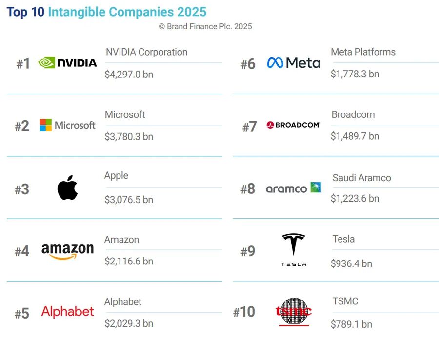 英国品牌评估咨询公司“品牌金融”(BrandFinance)发布的“GIFT(GlobalIntangibleFinanceTracker)2025”排出全球无形资产价值(IntangibleValueRanking)最高的100个公司榜单。英伟达成为全球无形资产价值最高的公司,达到4.3万亿美元。