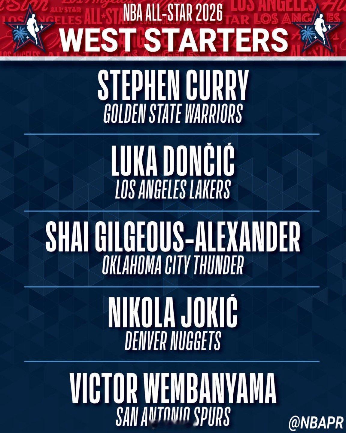 NBA全明星首发阵容公布,卢卡为票王。不过今年的比赛形式为美国队vs世界队,所以真正的首发,可能是把库里和字母哥对掉。 另外,詹姆斯生涯21年来首次无缘全明星首发。