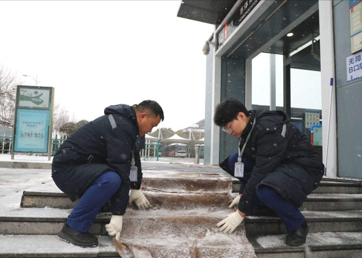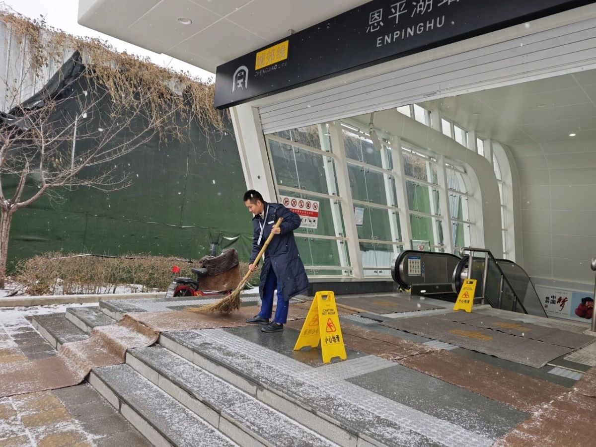 雪落无声,服务有声。从站台到出入口,从车厢到通道,郑州地铁人挥动扫帚、铺上防滑垫、放置提示牌……及时在出入口周边撒布融雪剂,对车站出入口、站外积雪进行循环清扫,服务始终满格,温暖永远在线。