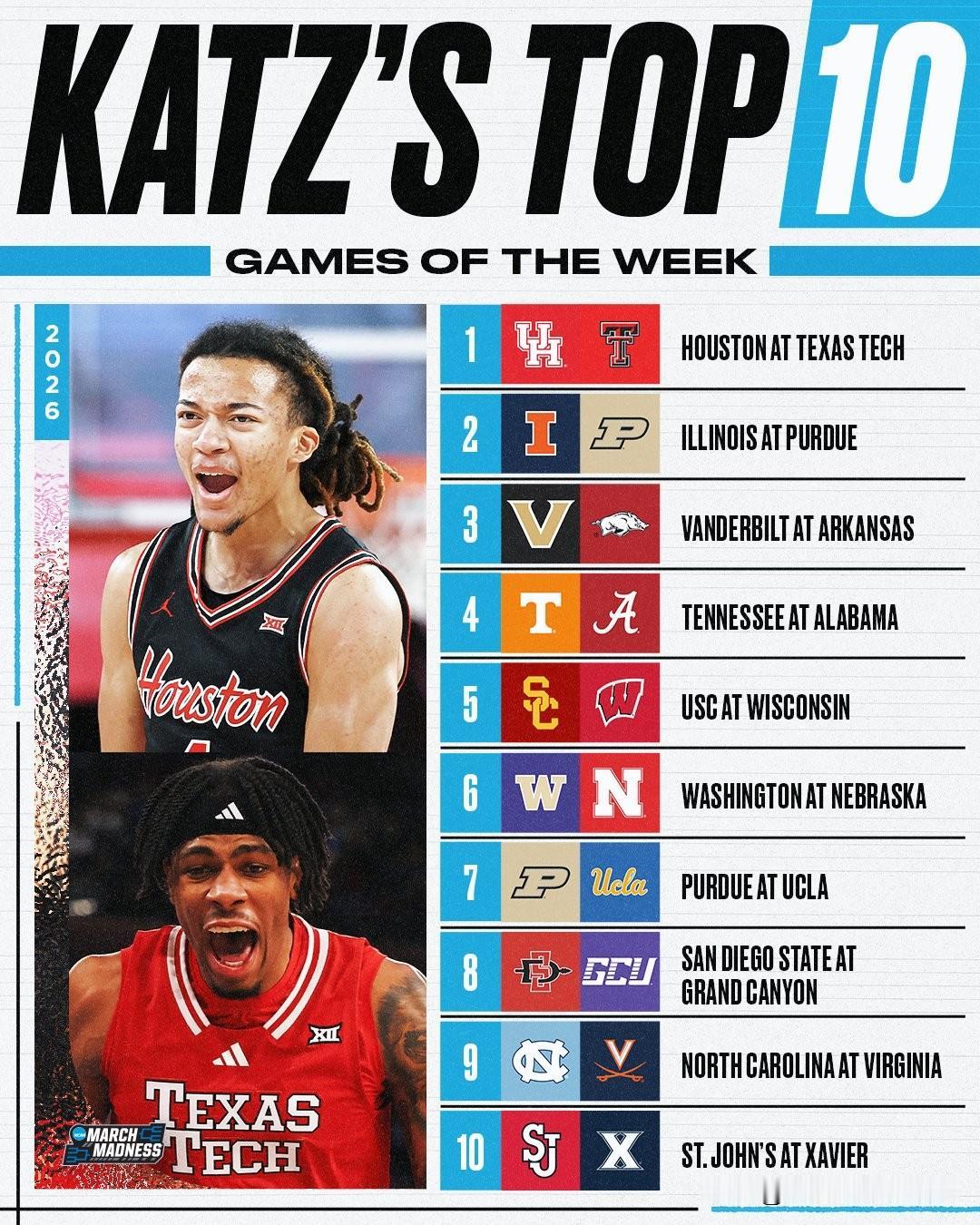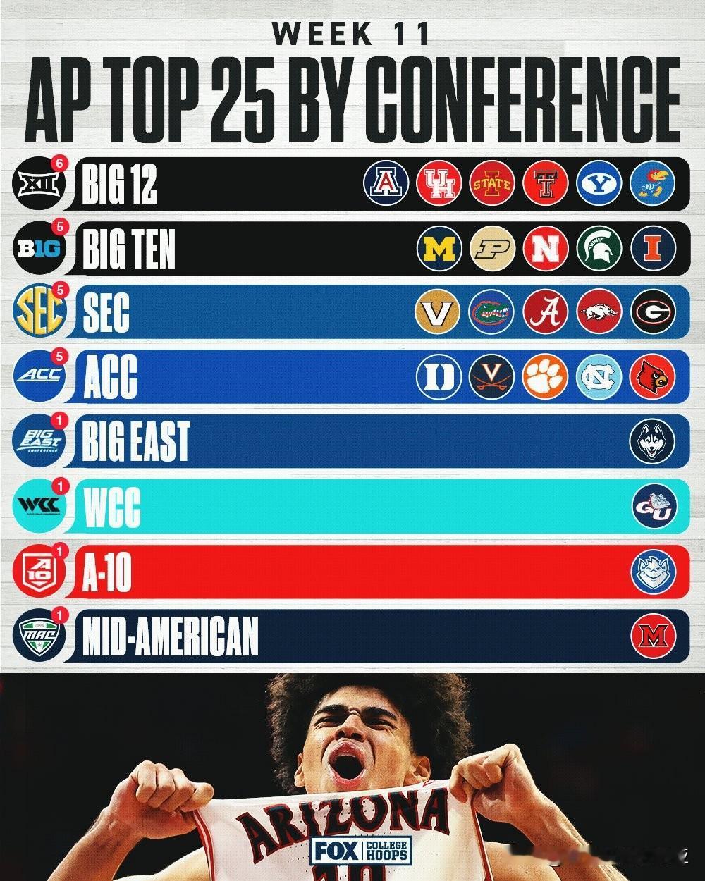 美联社公布第十一周前25强榜单,亚利桑那大学稳居全美第一,官网评选的上周最佳球队是佛罗里达大学,2026年nba选秀 最佳球员是杜克前锋Cameron Boozer,最佳新人是堪萨斯后卫Darryn Peterson,内布拉斯加大学排在第七位是队史最高排名。