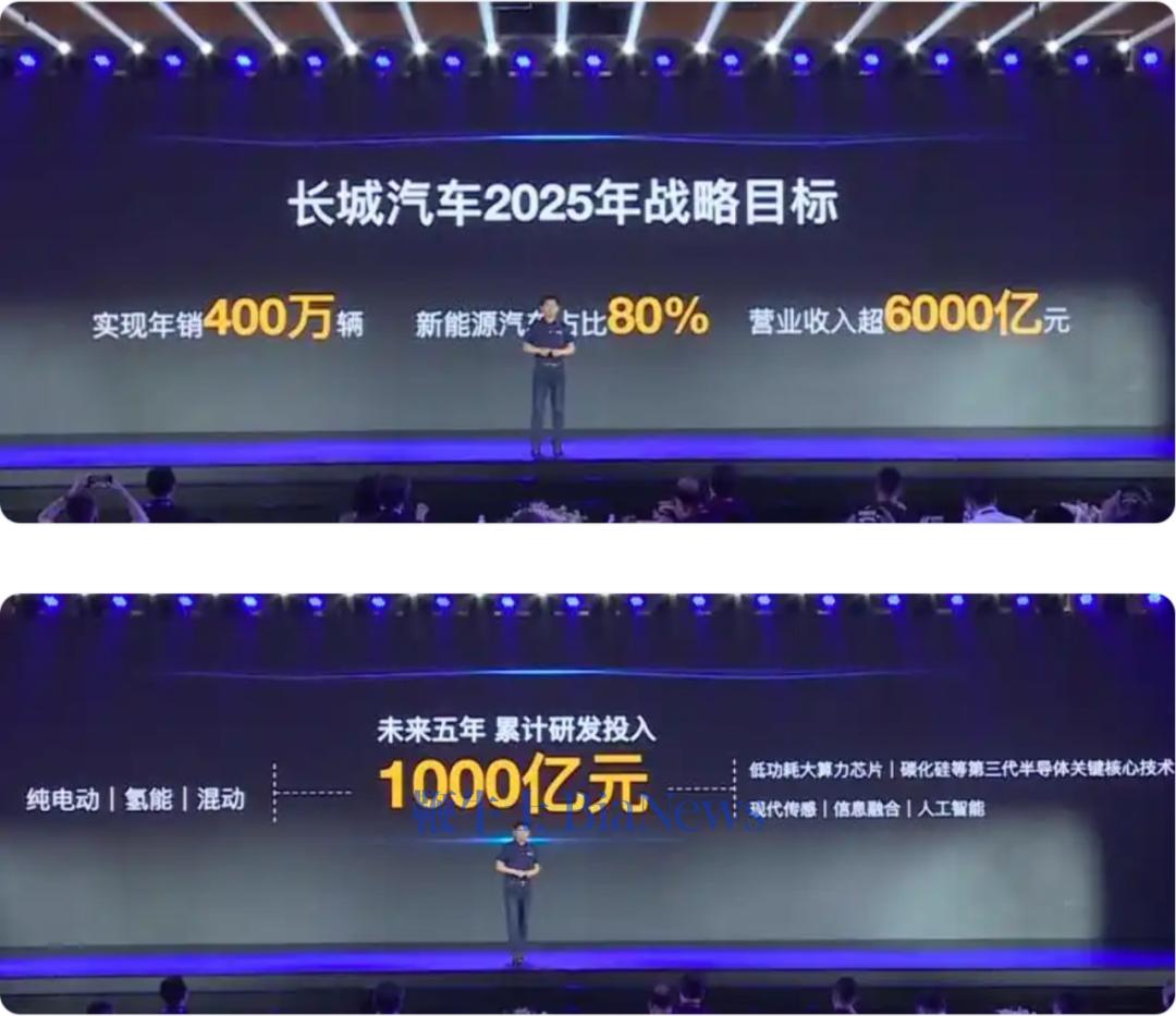 长城汽车董事长魏建军曾放下狠话:至2025年,长城汽车将实现年销售400万辆、新能源汽车占比80%、营业收入超6000亿元的目标。为此,长城汽车未来五年累计研发投入将达到1000亿元。