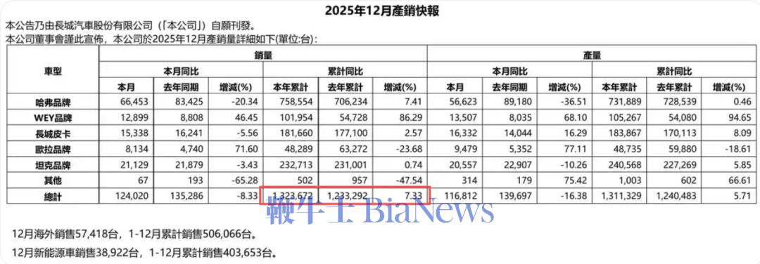 2025年全年,长城汽车累计销售汽车132.37万辆,同比增长7.33%,创下历史新高;其中新能源车型销售40.37万辆,同比增长25.44%,海外市场销量50.61万辆,同比增长11.68%,两大核心增长点均实现了突破。