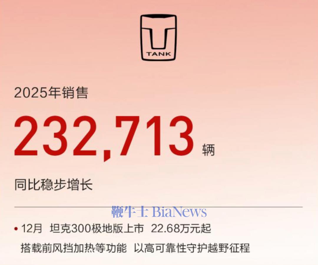 2025年,坦克销量为23.27万辆,长城汽车方面提到的“同步稳步增长”。事实上,通过数据不难发现,2024年坦克的销量为23.10万辆,相差只有1700辆车。