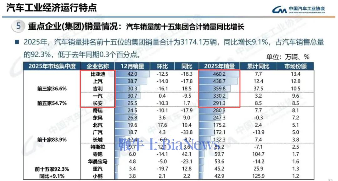 数据显示,2025年自主品牌乘用车国内零售销量排名前五的车企分别为比亚迪、吉利汽车、长安汽车、奇瑞汽车和长城汽车,销量分别为345.90万辆、260.52万辆、140.26万辆、133.06万辆和70.20万辆。
