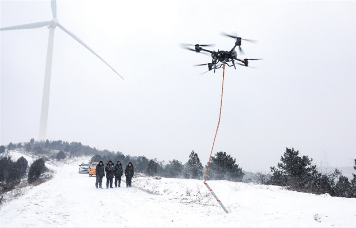 除此外,公司还在装备上不断迭代。从以前冰情要靠人工跋涉巡查,到如今通过“在线监测+无人机巡检+人工观测”,打造“空天地”观冰体系,实现了地区21条易覆冰线路34段862基易覆冰杆塔的观冰全覆盖。公司还在变电站内创新应用“融冰母排”技术,使得站内两条线路能快速联通、同时融冰,将单次作业时间从10小时压缩到3小时以内,并引入“无人机+空包弹”进行机械振动除冰、重载无人机挂载除雪棒进行“御剑”除冰等。