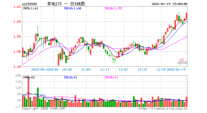 1月19日,家电ETF(159996)涨1.18%,成交额1.05亿元。当日份额增加3800.00万份,最新份额为9.23亿份,近20个交易日份额减少3000.00万份。最新资产净值计算值为15.00亿元。