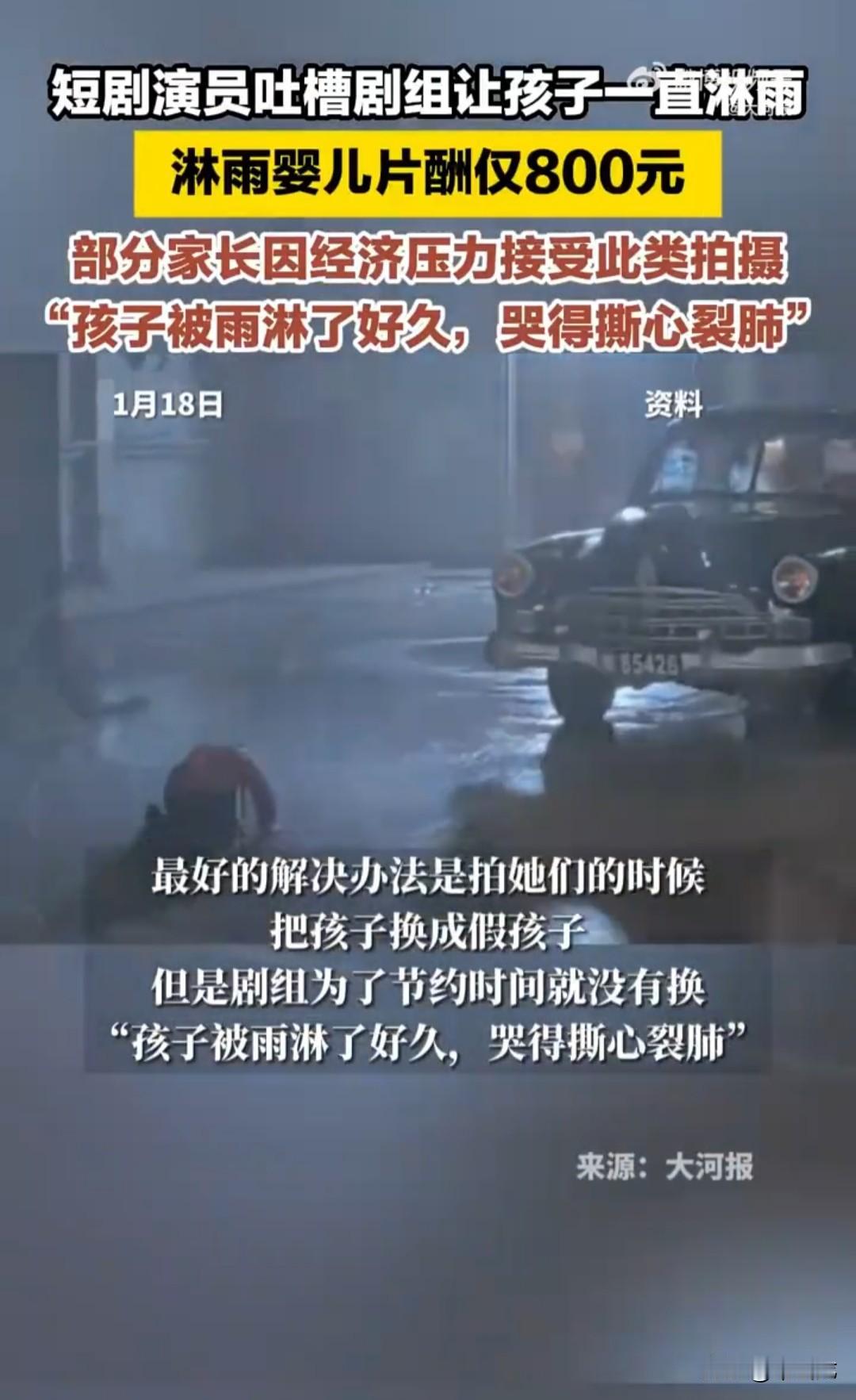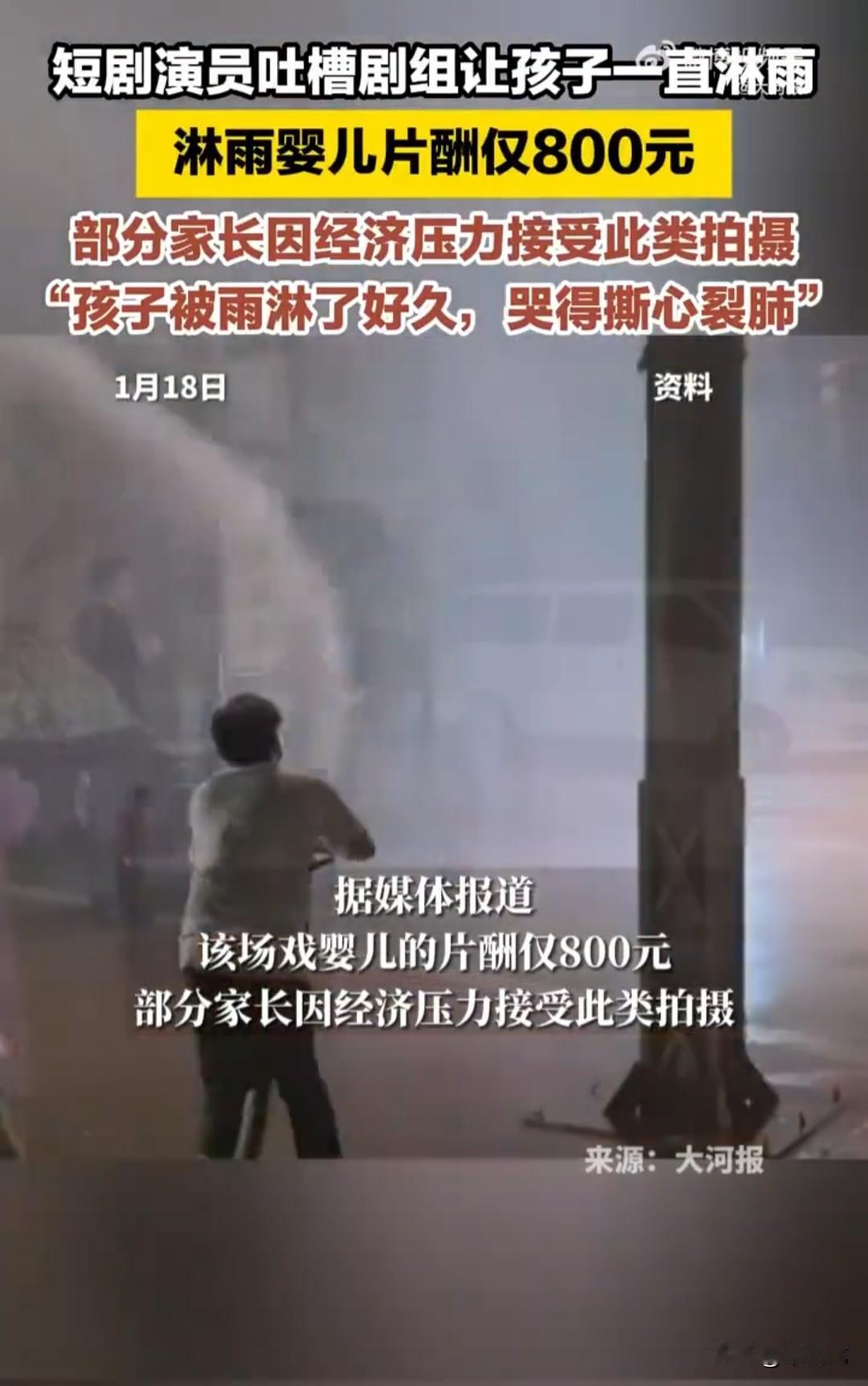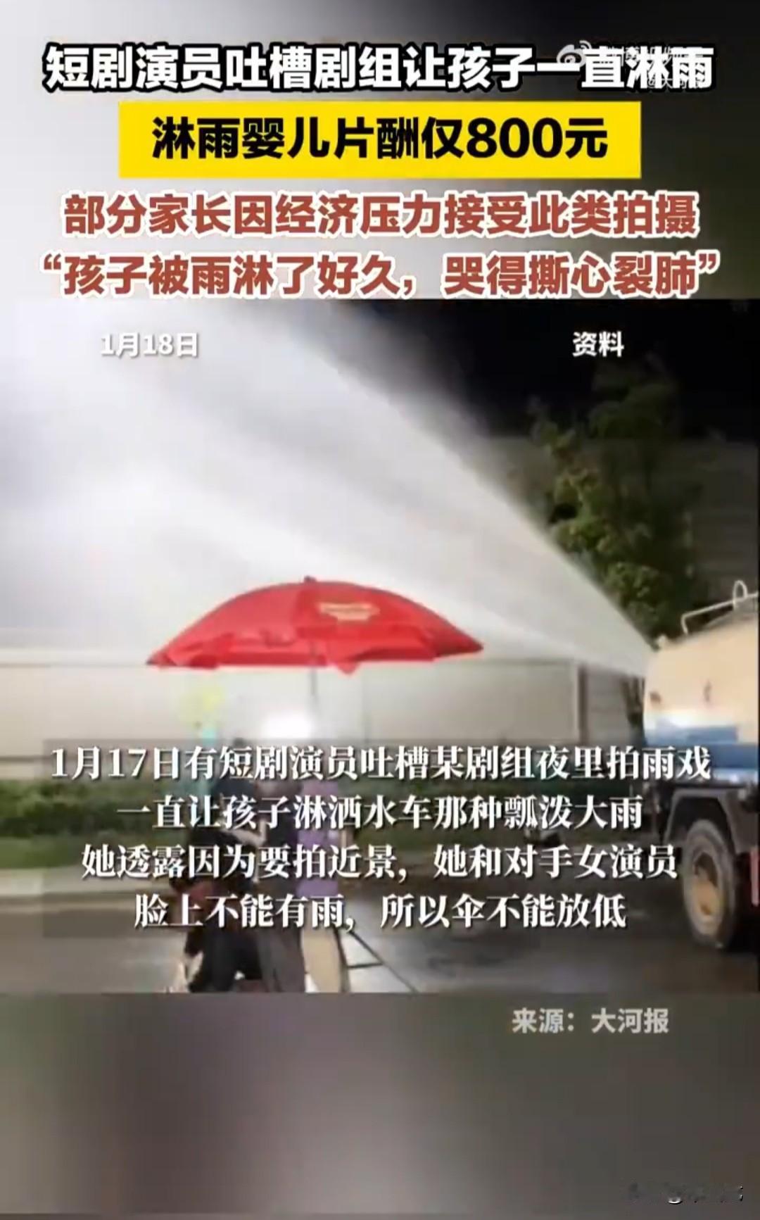 为了拍短剧,任由还在襁褓中的婴儿在瓢泼大雨中经受煎熬。 这令人心碎的一幕发生在某短剧组拍摄深夜下大雨的剧情中。 视频中,穿着精致、衣冠楚楚的男女主人公自己打着伞,却任由卖花女孩跪在雨中,或襁褓中的婴儿,在母亲后背上被雨伞边缘流下的雨水直接淋到头上。 镜头外面,停着一辆洒水车,一名男子拿着高压水管对着主人公肆意喷洒,以此营造出漫天瓢泼大雨的场景。 在气温降低的夜晚,冰凉、湿重的雨水从头顶倾泻而下,大人都可能受不了,更何况还在因襁褓中、正呱呱吃奶的婴儿。 宝宝被豆大的雨点打在头上,因为疼痛和寒冷,宝宝哭得撕心裂肺。 但大人们正面不改色、煞有介事地胡编乱造着狗血情节。 为什么不用玩具娃娃? 说是为了情节真实。 真是荒唐透顶,这些狗屁不通、漏洞百出、颠覆三观、粗制滥造的短剧,你还跟我讲真实。 听了让人笑掉大牙。 为什么要让孩子拍这种摧残身体的无聊戏,家长说是迫于经济压力,拍短剧一天才有800元。 800元,一旦孩子被淋成重感冒或肺炎,800元连交住院费都不够。 这么小的孩子就被父母拿来做血包了,做父母的心也真够狠啊,为了一点蝇头小利,把孩子都卖了。 家长还吐槽剧组一直让孩子淋雨,他还真有这块脸说。 一个巴掌拍不响,如果家长不愿意,剧组可以强拍吗,关键问题还是在家长。 这种家长可以按虐待孩子罪刑拘了,这种无聊短剧要坚决抵制和封杀。 (素材来源:大河报)