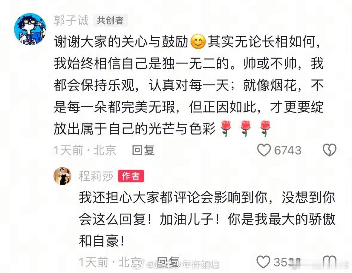 郭晓东程莉莎儿子15岁了 郭晓东儿子郭子诚回应长相问题,他的回答很暖心:“无论长相如何,我始终相信自己是独一无二的。”15岁的少年能有这样的认知,爸爸妈妈的教育很成功。