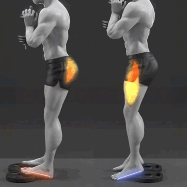 深蹲 【深蹲细节】复习深蹲知识:一个小细节的不同,练到的肌肉也不同,比如深蹲的垫片位置👇🏻👇🏻第一个把你的前脚掌垫高。当前脚掌垫高之后,再做深蹲,你的身体必须向前俯身才能保持平衡,这个时候,髋关节的屈髋角度自然增大,对臀肌的刺激也增大,就能更多练到了屁股。第二个把你的脚后跟垫高。这个时候身体相对垂直,重心相对向后,你的屈膝便会相对多,而屈髋相对少。这种情境下再做深蹲,便能更多练到你的大腿前侧。最近想练臀腿的朋友,可以来感受一下区别运动康复健闻登顶计划