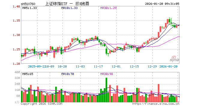 1月20日,上证综指ETF(510760)开盘涨0.00%,报1.331元。上证综指ETF(510760)重仓股方面,农业银行开盘跌0.14%,工商银行跌0.13%,贵州茅台涨0.25%,中国石油涨0.00%,招商银行涨0.05%,工业富联跌0.99%,中国人寿跌0.04%,寒武纪跌0.19%,中国银行涨0.00%,中国平安涨0.08%。