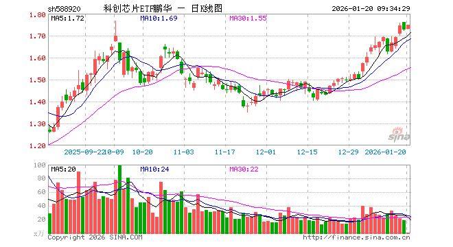 1月20日,科创芯片ETF鹏华(588920)开盘涨0.06%,报1.729元。科创芯片ETF鹏华(588920)重仓股方面,海光信息开盘涨1.97%,澜起科技跌0.68%,中芯国际跌0.23%,寒武纪跌0.19%,中微公司跌0.79%,芯原股份跌0.18%,华虹公司跌0.06%,沪硅产业跌0.35%,华海清科跌0.71%,晶晨股份涨0.30%。