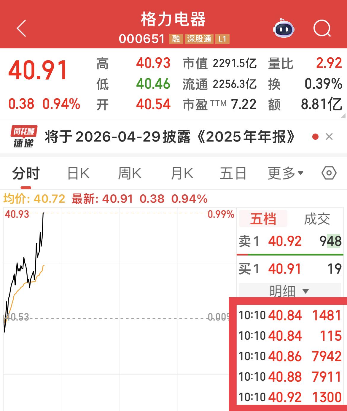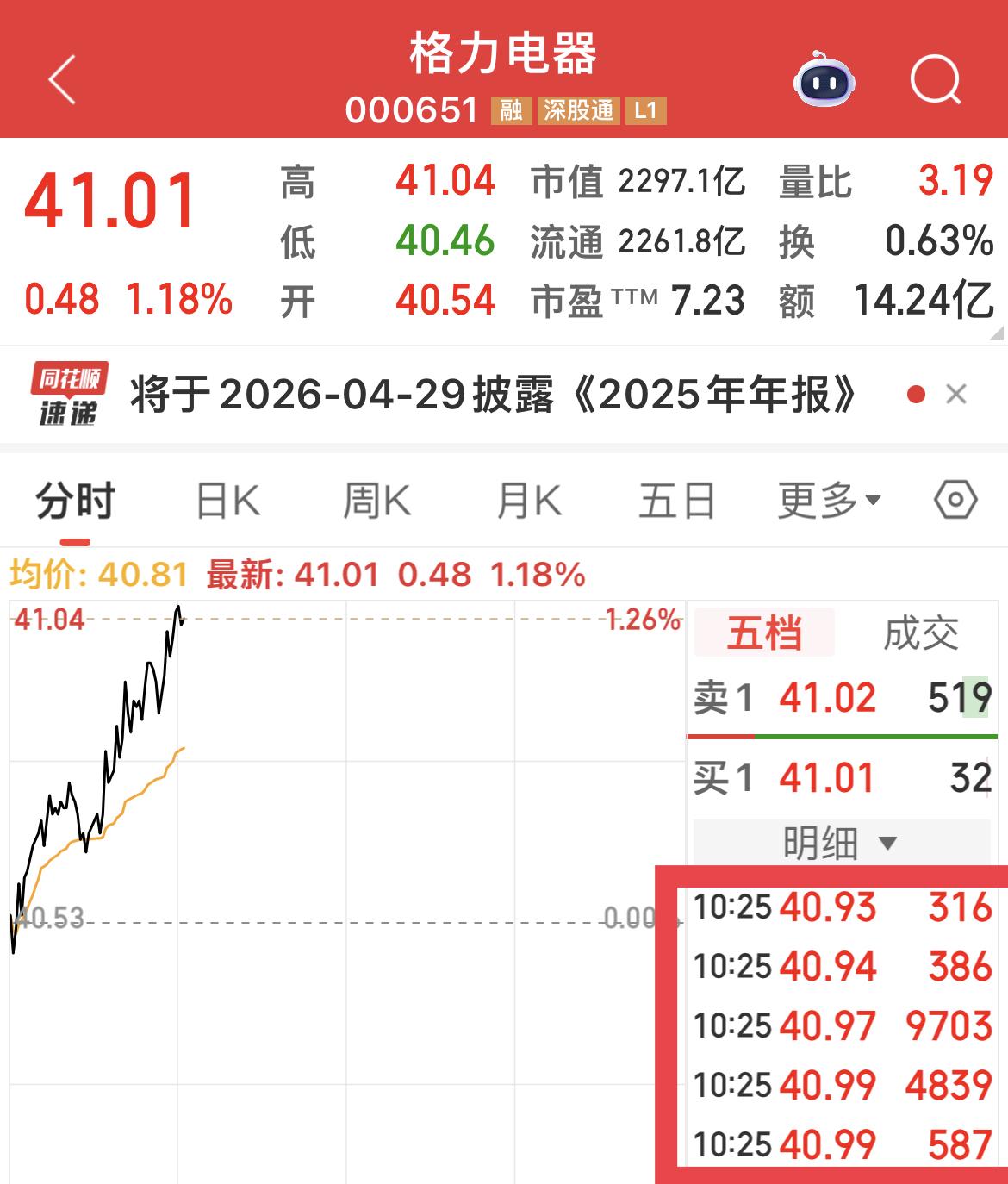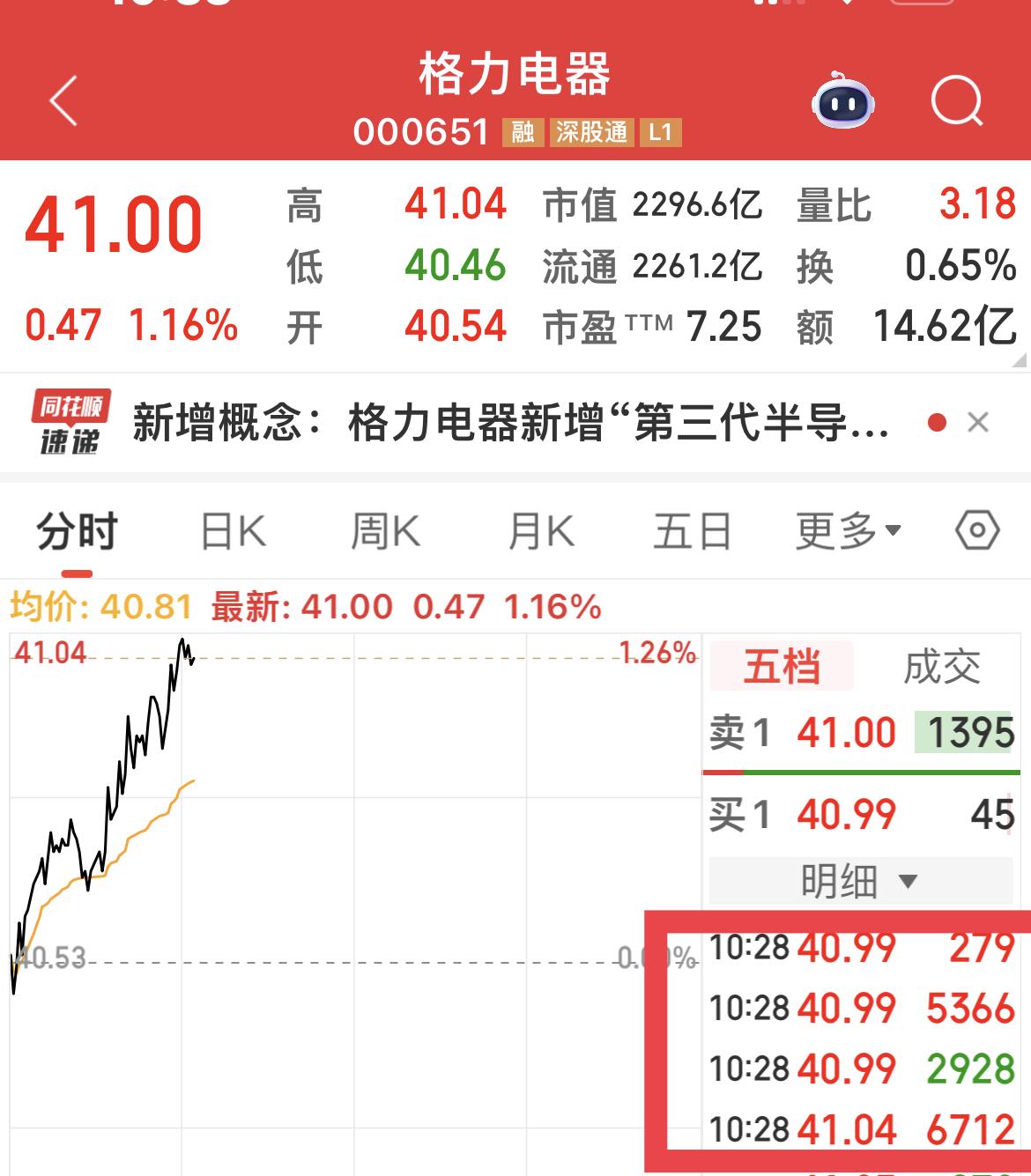格力电器盘中,多次出现超级大单买入。