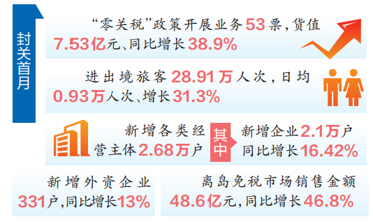 有效激发市场活力,发展动能加速集聚。封关政策的落地实施有效激发了市场投资创业热情,越来越多的企业来到海南发展业务,首月新增各类经营主体2.68万户,其中新增企业2.1万户,同比增长16.42%;企业增量占总量比例从封关前的42%提高到近80%,结构优化趋势进一步凸显。新增外资企业331户,同比增长13%。离岛免税市场持续火热,首月销售金额48.6亿元,同比增长46.8%;购物人数74.5万人次,同比增长30.2%;购物件数349.4万件,同比增长14.6%。
