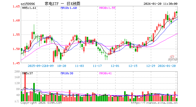 家电ETF(159996)业绩比较基准为中证全指家用电器指数收益率,管理人为国泰基金管理有限公司,基金经理为苗梦羽,成立(2020-02-27)以来回报为62.55%,近一个月回报为7.61%。