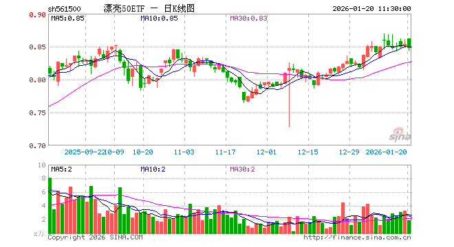 1月20日,截止午间收盘,漂亮50ETF(561500)跌0.82%,报0.847元,成交额162.21万元。漂亮50ETF(561500)重仓股方面,东方财富截止午盘跌0.26%,恒瑞医药跌0.95%,阳光电源跌5.79%,迈瑞医疗跌1.21%,豪威集团涨0.52%,万华化学涨3.16%,福耀玻璃涨0.59%,金山办公跌2.14%,同花顺跌1.73%,天孚通信跌5.20%。
