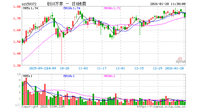 1月20日,截止午间收盘,创业板50ETF万家(159372)跌1.84%,报1.707元,成交额160.17万元。创业板50ETF万家(159372)重仓股方面,宁德时代截止午盘涨0.97%,中际旭创跌3.92%,东方财富跌0.26%,新易盛跌6.12%,阳光电源跌5.79%,胜宏科技跌4.94%,汇川技术跌0.83%,迈瑞医疗跌1.21%,亿纬锂能跌2.66%,同花顺跌1.73%。