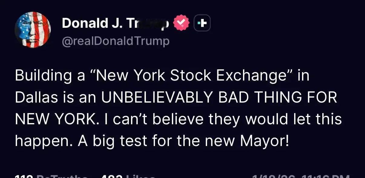 就在1月18日,美国总统特朗普在自己的社交平台上直接开炮,直指达拉斯搞出一个“纽约证券交易所”对纽约来说是超级糟糕的事,他直呼不敢相信会允许这种事发生,还说这对新上任的纽约市长是个大考验。 事情的根源是这样的:纽约证券交易所的母公司洲际交易所去年就决定在得克萨斯州加设一个次级上市地点。结果2025年初,位于达拉斯的NYSE Texas正式开张,前三个月就有10家公司选择在这里双重上市,包括能源巨头哈里伯顿和特朗普媒体科技集团(也就是Truth Social的母公司)。 其实这不是全新交易所,而是把原本在芝加哥运营了143年的电子交易平台整体搬到达拉斯,改名成了NYSE Texas。企业还是能在纽约主板上市,但多了一个得州选项,方便那些扎根南方、喜欢当地营商环境的美国公司。 特朗普这么生气,主要觉得这会削弱纽约作为全球金融中心的地位。毕竟得州这些年发展太猛,人口暴增、经济活力强、政策友好,吸引了大批企业和资金南下。NYSE Texas一开,就迅速抢到双重上市,说明吸引力真不小。 我的看法是,这其实反映了美国经济重心的悄然转移。纽约的华尔街传统光环还在,但得州凭借低税、少管制和庞大市场,已经在金融领域插旗。未来如果更多公司把部分业务放在得州,纽约真得好好想想怎么守住老大位置了。这场“东西部金融拉锯战”才刚开始