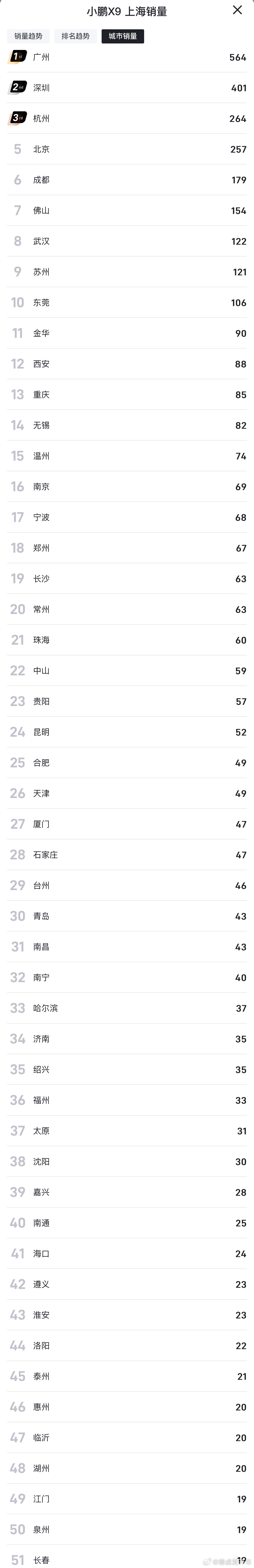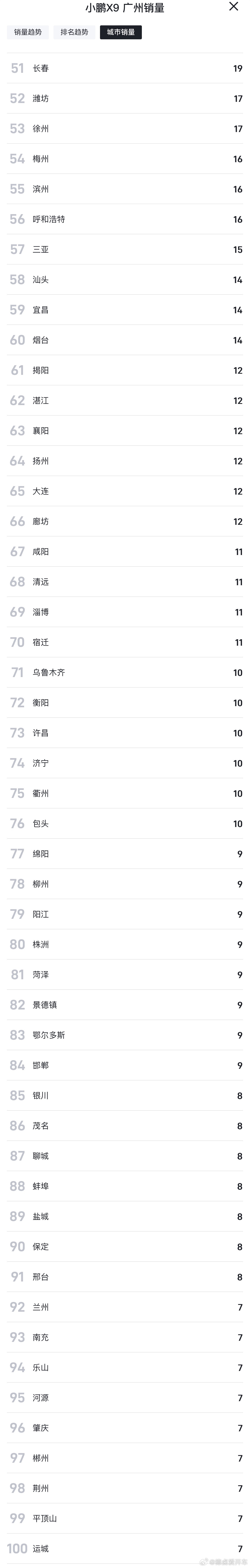 小鹏 X9 上个月终端销量TOP 100城,华南、华东是新能源大区依旧是主力,华北、西南、华中区域也开始有动静,尤其是在华北地区也拿到不错的销量,期待接下来 X9 超级增程能持续渗透。小鹏X9新能源汽车