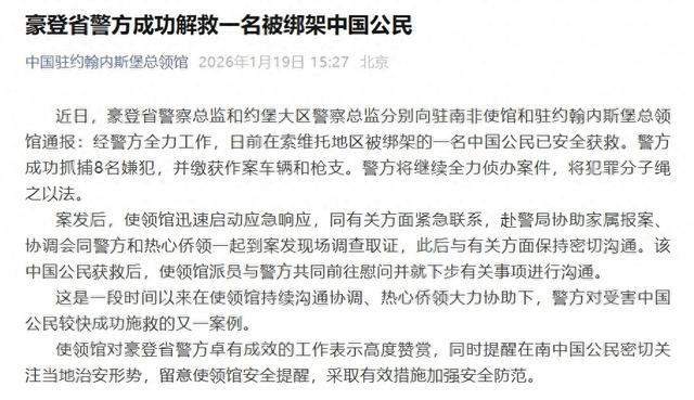 据悉,南非豪登省警察总监和约堡大区警察总监近日分别向驻南非使馆和驻约翰内斯堡总领馆通报:经警方全力工作,日前在索维托地区被绑架的一名中国公民已安全获救。警方成功抓捕8名嫌犯,并缴获作案车辆和枪支。警方将继续全力侦办案件,将犯罪分子绳之以法。