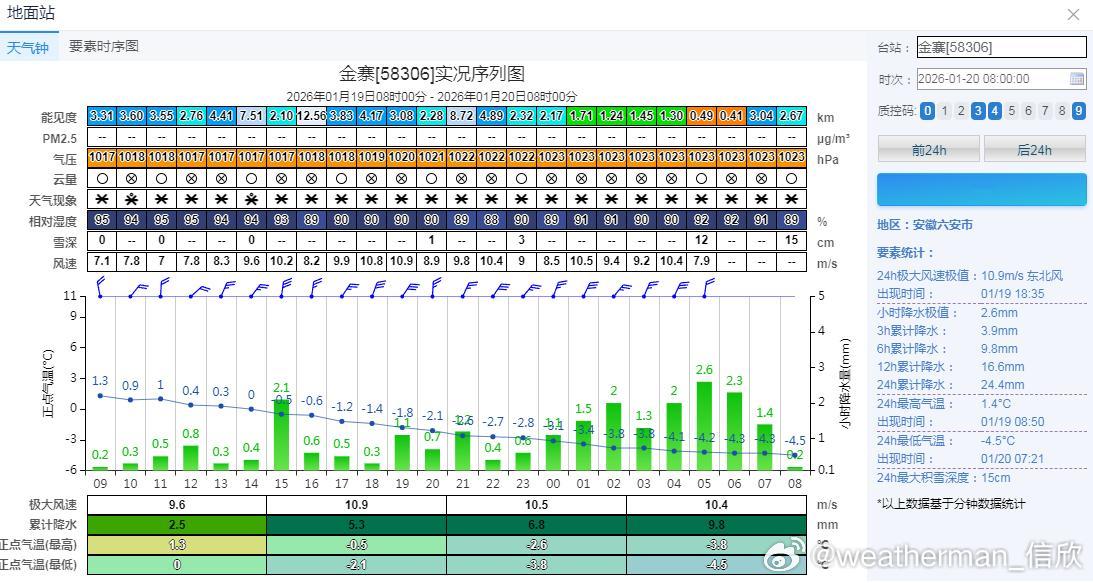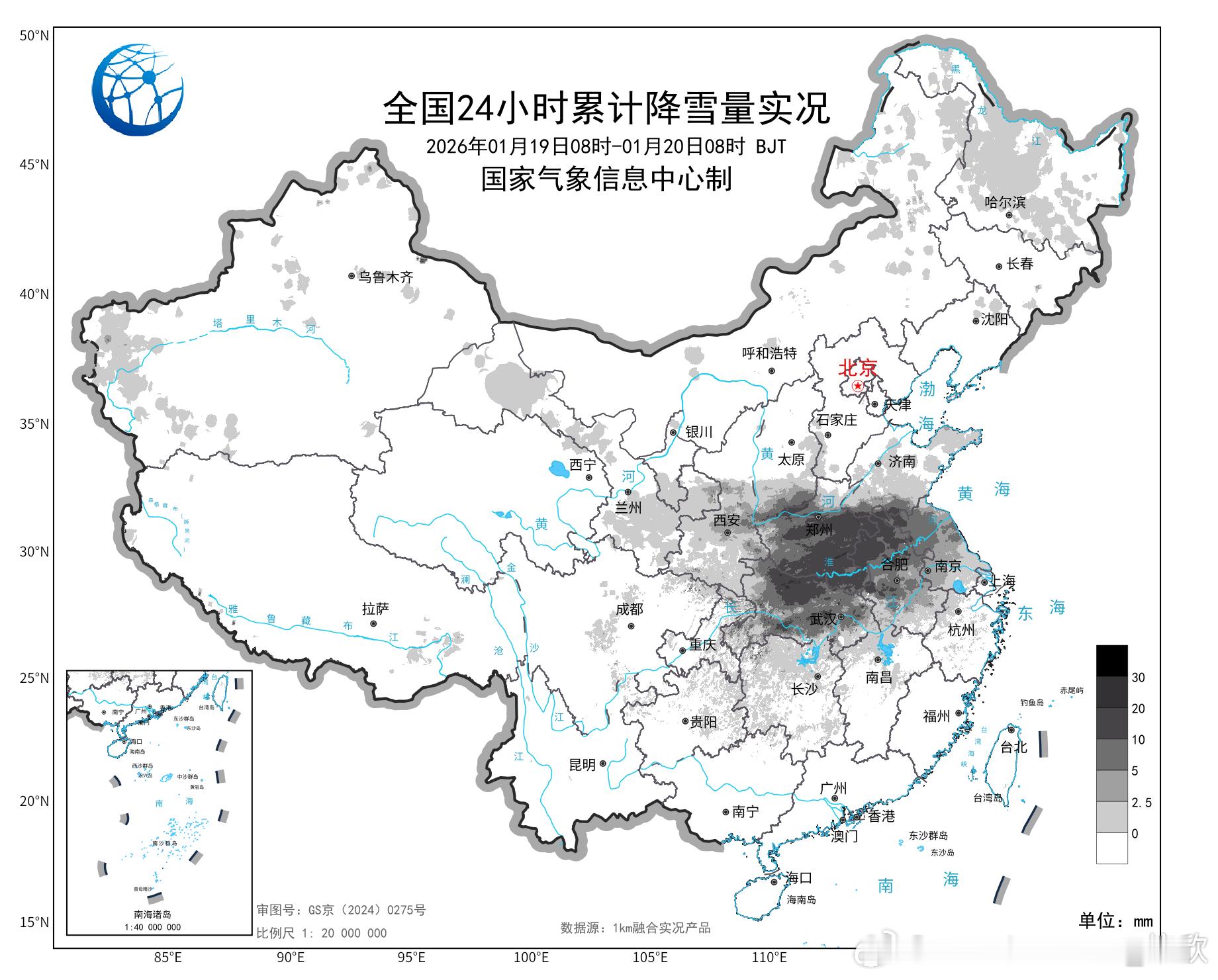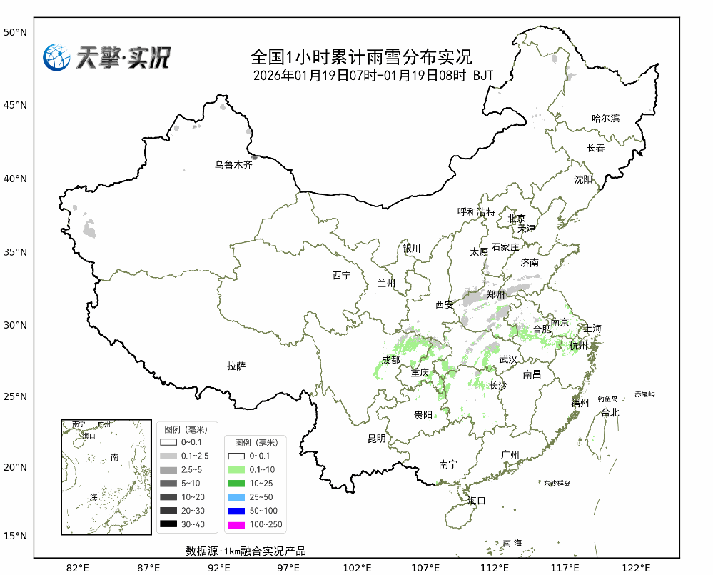 【降雪和冻雨】昨天黄河长江之间区域的降雪发展增多,夜间向南推进。河南湖北安徽江苏北部多地出现大雪-暴雪。安徽金寨、湖北丹江口出现大暴雪。今晨8时积雪,河南宁陵、新郑、西平、驻马店都是18厘米、安徽蒙城17厘米、湖北谷城16厘米、山东台儿庄15厘米,江苏徐州和丰县12厘米,为各省今晨积雪最深站点。大城市中,武汉、合肥、南京、上海、杭州、南昌均已经观测到降雪。今晨8时积雪,合肥7厘米、武汉3厘米、南京3厘米。今晨长沙降水相态更复杂,先观测到雪,之后又出现冻雨。今晨8时降雪西段最南端,位于湖南资阳-广西资源一线。东段在浙江上虞-淳安-江西南昌一线。今天冷空气继续南下,降雪向南推进,雪线西段位置变化不大,东段可能推进到浙江南部-江西中南部。总体降雪强度减弱,今晨中央气象台解除暴雪预警,但在湖北东南部、江西西北部、湖南中部局地还有大雪(5~6毫米)。另外冻雨可能增多。中央气象台继续发布冰冻预警,预计,1月20日08时至21日08时,贵州中部和东部、湖南中南部、广西北部、江西西部等地的部分地区有冻雨或冰粒,上述大部地区冻雨量1~2毫米,湖南西南部、贵州东南部、广西北部部分地区3~5毫米、局地可达6毫米以上。