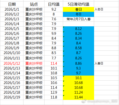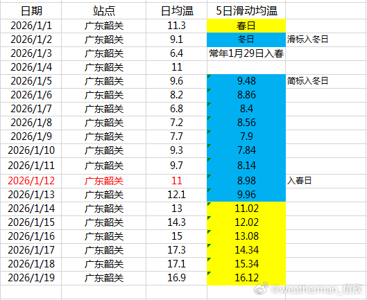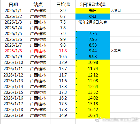 【季节】近期南方的回暖使得春天范围有所北扩。广西桂林1月8日、广东韶关1月12日、重庆沙坪坝1月12日已经反推判定入春。2025-2026年气象标准的冬季,桂林只有7天,韶关10天,重庆11天。备注,按照国家气候中心的滑动标准,提前30天以上才二次判定,桂林提前29天、韶关提前17天、重庆沙坪坝提前25天,均不再二次判定。但今天因为寒潮影响,其实会短暂返冬,24日以后有望重见春日。另外常年无冬、秋春相连的华南云南多地,按照冬季气温最低点(拐点)判定入春。未来的寒潮影响,有些地方也可能创新低,有些未必创新低,因此目前无法明确给出常年无冬区是秋还是春,暂时标注为春或秋。