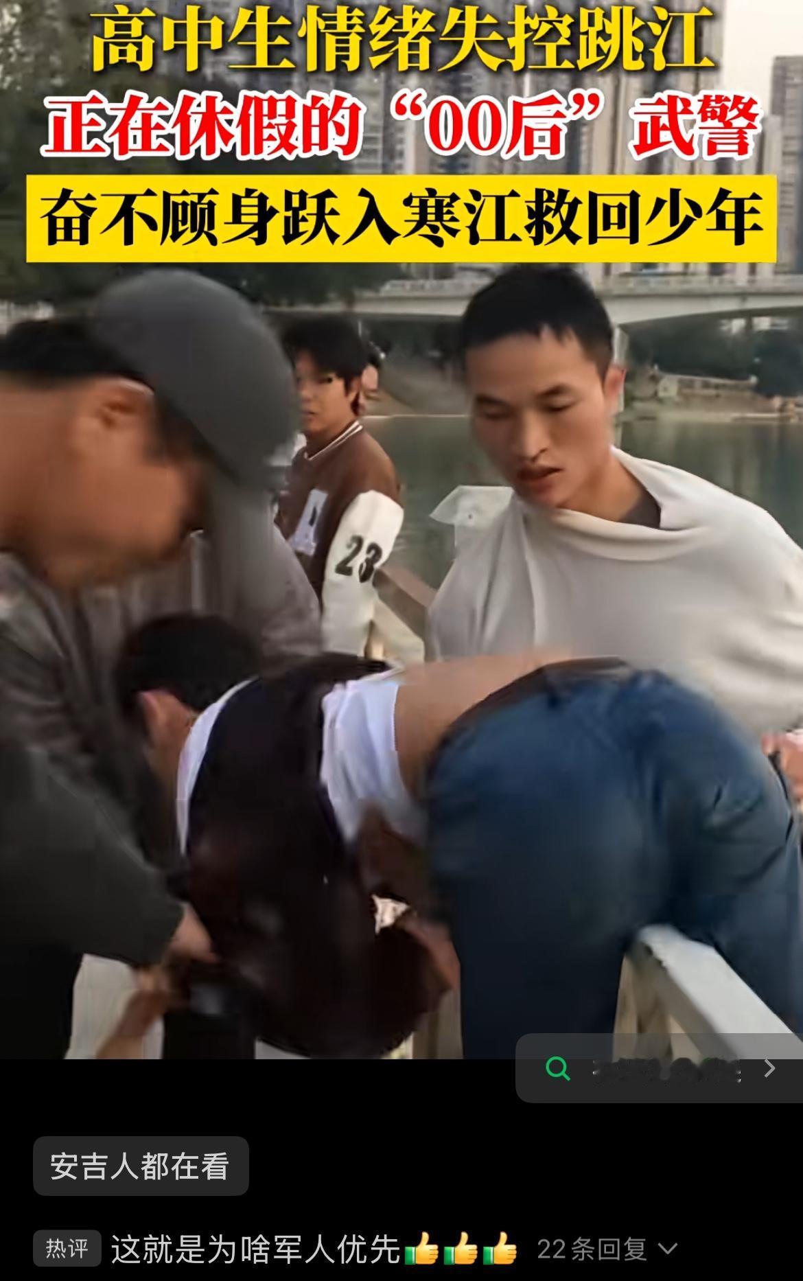 休假的00后武警跳江救人这事儿,真的太顶了! 你想啊,大冷天的,江水冰得刺骨,换谁都得打退堂鼓,但这位叫林宏骏的战士,听见有人喊救命,啥也没顾就跳下去了。他死死抓住那个跳江的高中生,硬把人拖上了岸,自己冻得够呛,擦了擦水就悄悄走了。 别再说现在的年轻人不行,这就是最好的证明。他没想着要表扬,没想着要回报,就觉得自己是个武警,救人是该做的事。这种刻在骨子里的责任感,比啥都强。 比起那些天天喊着躺平的人,他用行动告诉我们,真正的爷们儿,就是在别人需要的时候,能站出来扛事儿。换作是你,在这种情况下,敢不敢毫不犹豫地跳下去?评论区说说你的想法!