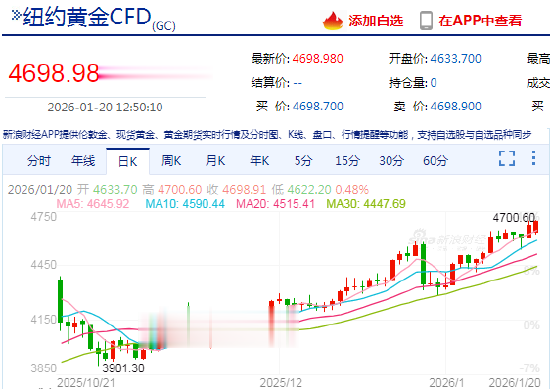 快讯:2026年1月20日,纽约期金向上触及4700美元/盎司,日内涨2.28%。现货黄金现报4692.9美元/盎司。