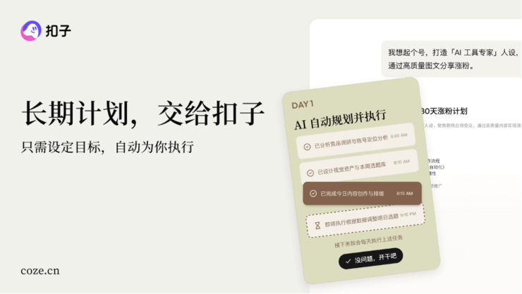 扣子2.0推出了AgentPlan,即“长期计划”,让AI从“即时问答工具”升级为“可持续运作的智能体”。用户只需要确定目标,规定好怎么完成、怎么实现,扣子能够持续执行,并向用户主动汇报、最终交付任务。