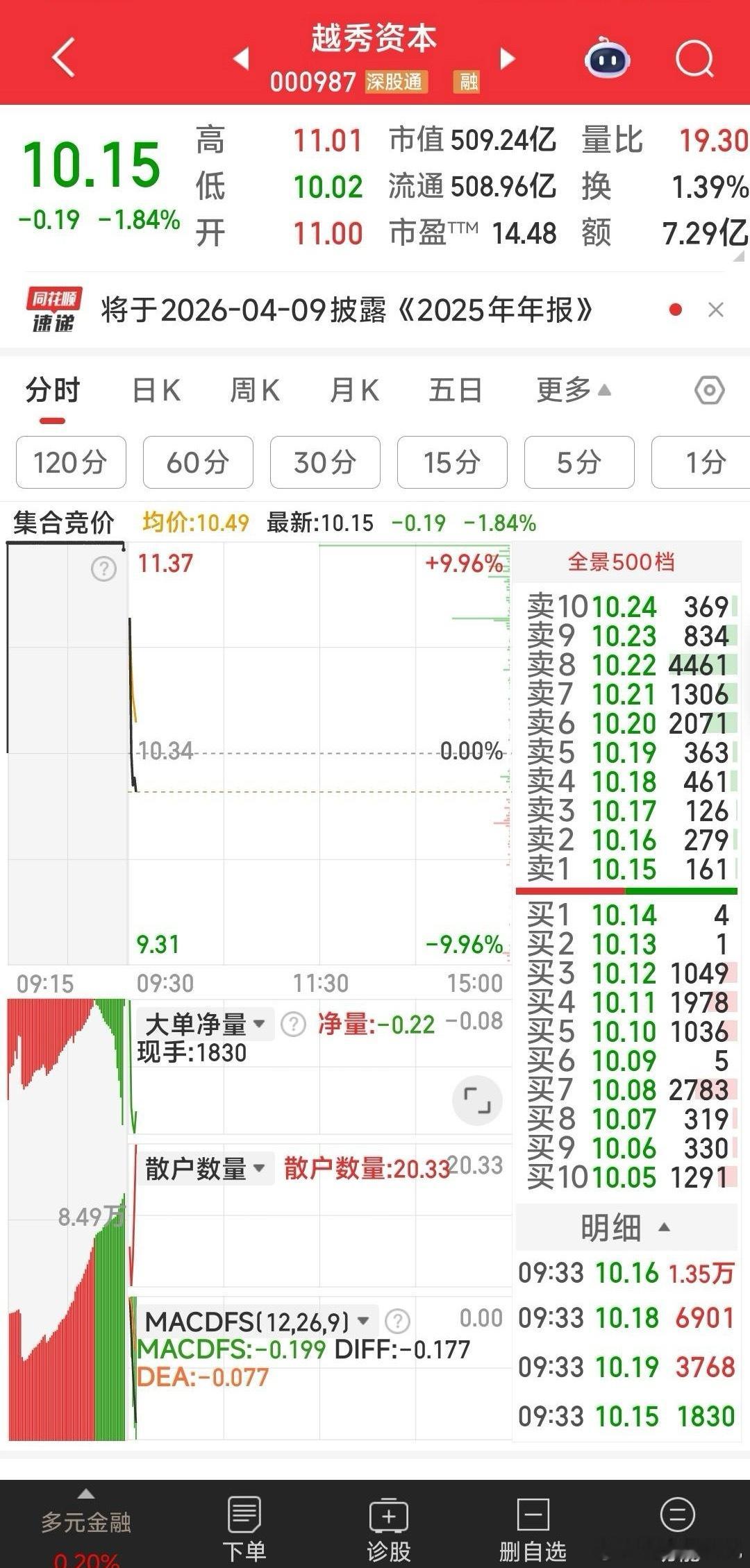 【为什么今天干了越秀资本】因为在昨天市场最恐慌时越秀资本缩量涨停且主力大单抢筹,并出现在四连阴时,故,认定此主力政治上明确,有方向感,会N起。故10.1元与庄共舞。