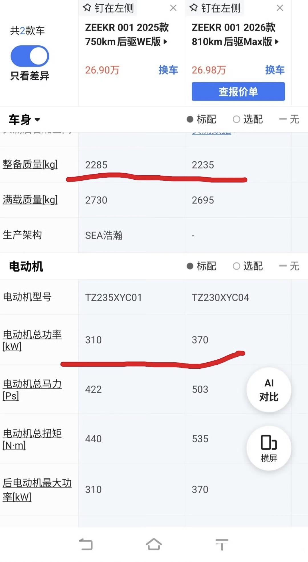 每次说极氪7x能耗降下来了,就有极氪001老车主前来喊冤。 不过极氪“能耗高”的帽子在2026款极氪001上应该好了不少。 2026款极氪001 对比 2025款极氪001 26款电池多了三度电,电机功率增大了60kw,但是续航反而增加了60km。 这不应该算是电池增加了3度电的功劳,部分原因是车重反而变轻了。 从2285kg 降低到了2235kg,车重的降低也有利于能耗的降低,所以续航能变长。 这是一个良性循环,反过来也是这样。 减重是新能源车以后最重要的功课,现在的电车实在太重了,还有将近3吨的车,在我看来真是笑话。 极氪001为了把车重降下来,电机从铝合金换成了镁合金,光这一项就把电驱壳体降了30%重量。 还有一点是900V,很多人觉得上高电压对能耗作用不大,工程上实测还是有效果的,电压升高,电流减少,线束损耗就减少了,还能用线径小一点的线。 个人觉得,新能源汽车控制在2.5吨以下的车重是比较合适的。【来自懂车帝车友圈】